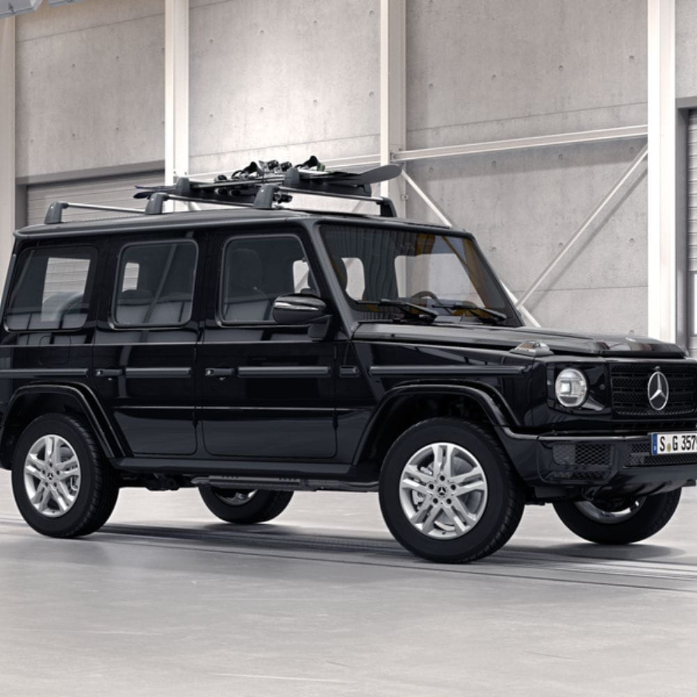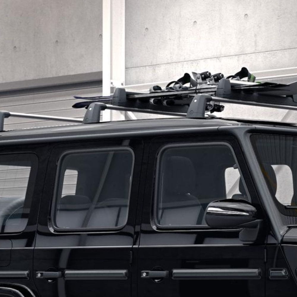 Aluminiowy bagażnik dopasowany dokładnie do nadwozia Twojego pojazdu Mercedes-Benz, składający się z dwóch poprzeczek wraz z profilami osłonowymi.