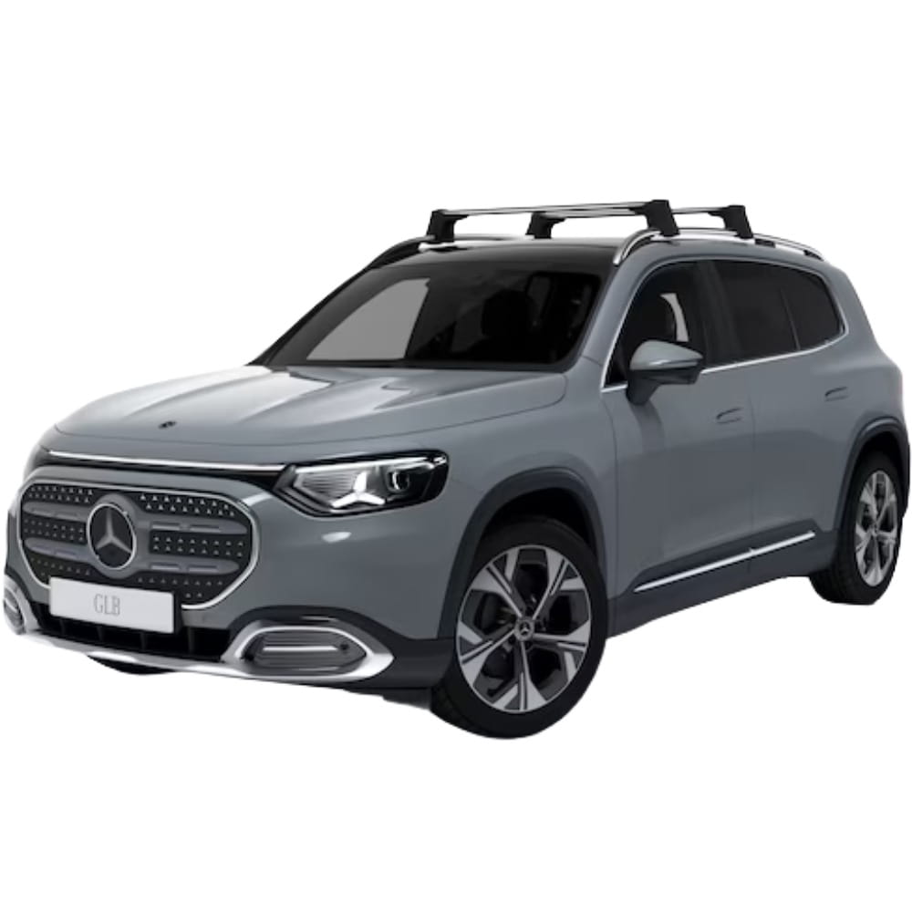 Aluminiowy bagażnik precyzyjnie dopasowany do nadwozia pojazdu Mercedes-Benz, składający się z dwóch belek poprzecznych z profilami osłonowymi. Rozwiązania transportowe: uchwyty na narty i snowboard, uchwyty na rowery lub boksy dachowe.