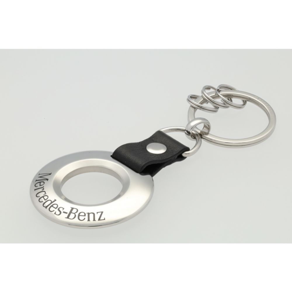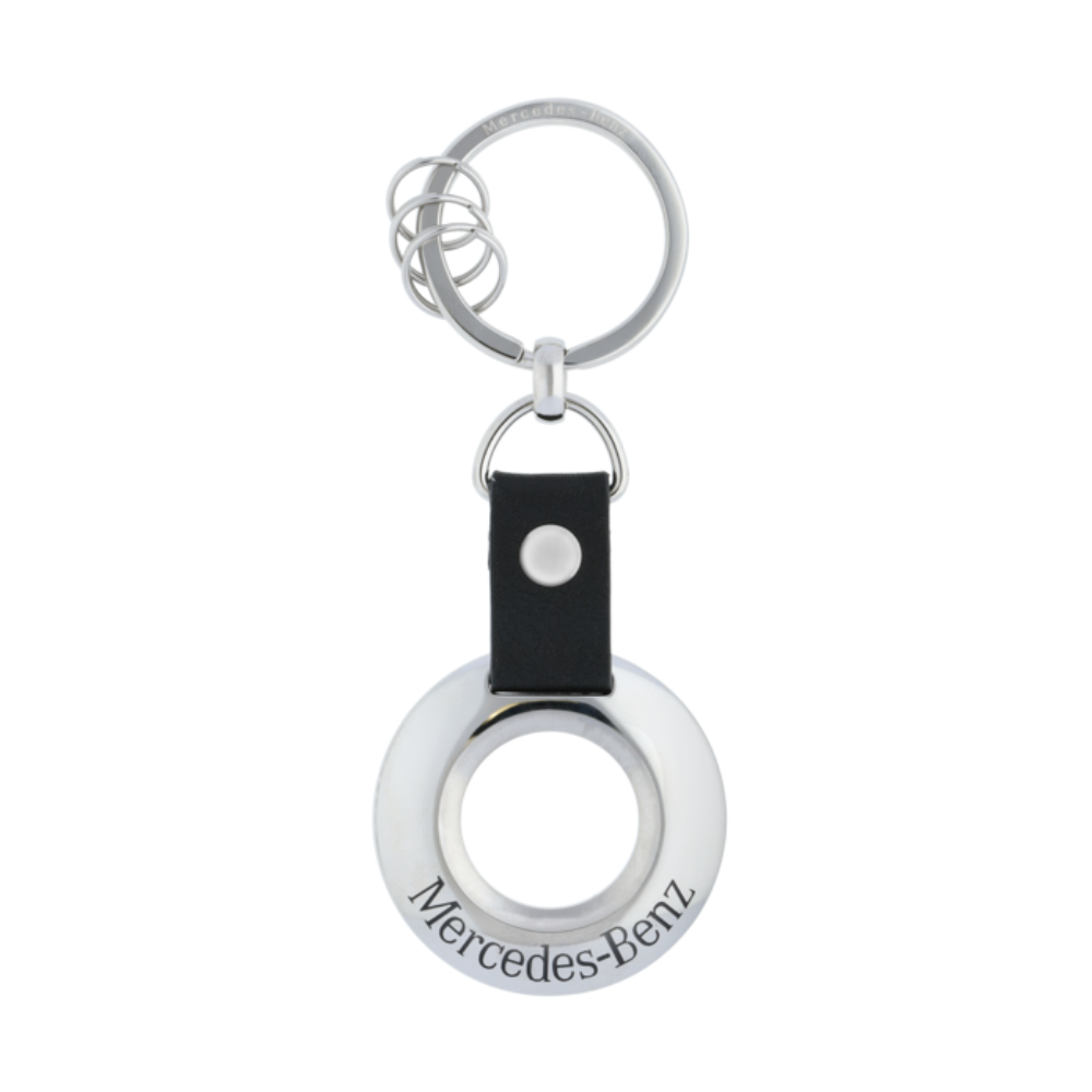 Breloczek do kluczy Mercedes-Benz to niezwykle elegancki, a zarazem funkcjonalny gadżet. Ma on srebrny kolor i jest wykonany ze stali nierdzewnej, dzięki czemu w trakcie używania będzie odporny na korodowanie. Czarny element breloczka to skóra bydlęca. Brelok jest niezwykle poręczny za sprawą płaskiego, odczepianego kółka z trzema małymi odczepianymi kółkami. Umożliwia to szybką wymianę oraz zdejmowanie pojedynczych kluczy. Jego łączna długość to około 9 cm. Na głównej części znajduje się napis Mercedes-Benz, co jeszcze bardziej podkreśla walory estetyczne breloka. Srebrny kolor nadaje mu nieco biżuteryjnego charakteru, a dobrej jakości wykonanie sprawia, że prezentuje się niezwykle elegancko. Sprawdzi się zarówno przy kluczach domowych, jak i samochodowych. Ze względu na okrągły kształt bez problemu można wyciągnąć go z kieszeni lub z torebki. To użyteczny gadżet, który spodoba się wszystkim miłośnikom marki Mercedes-Benz.