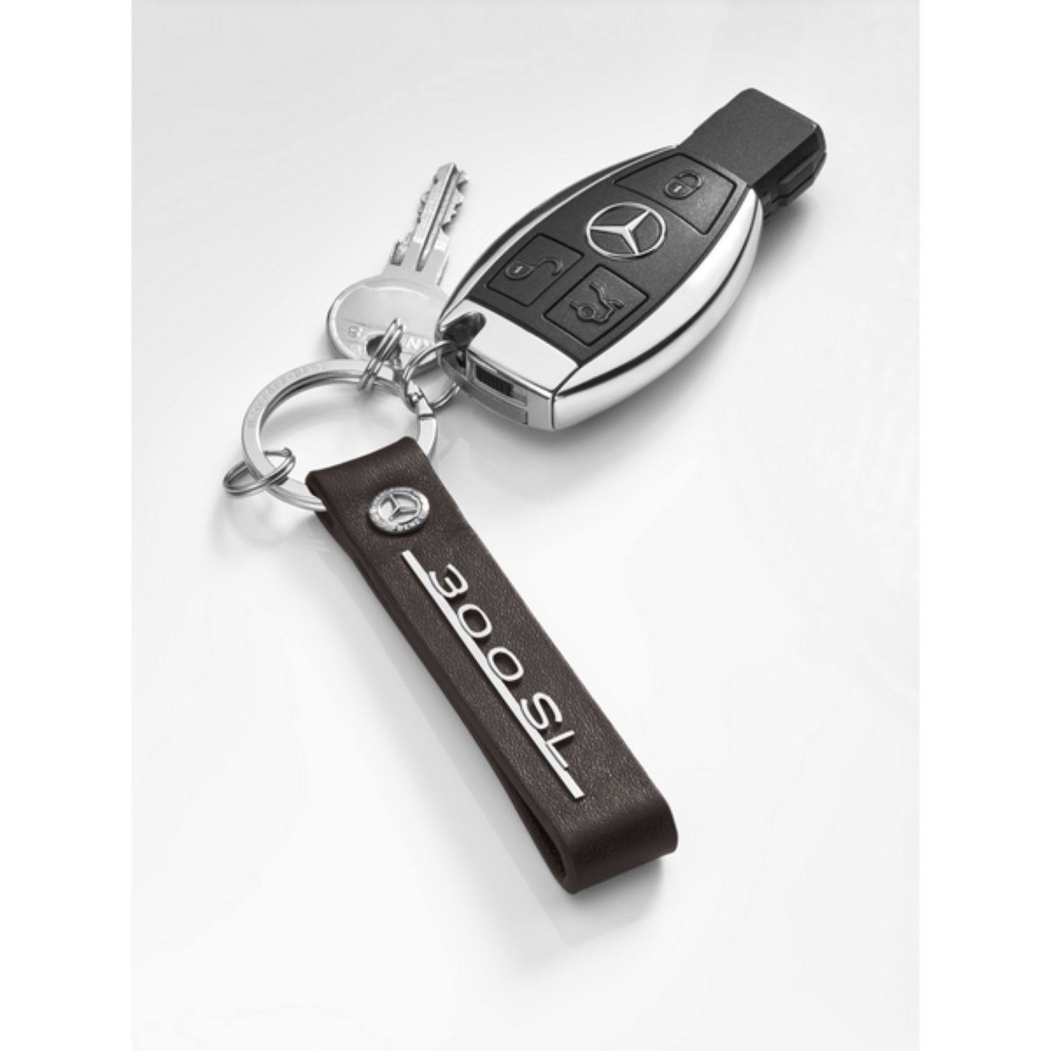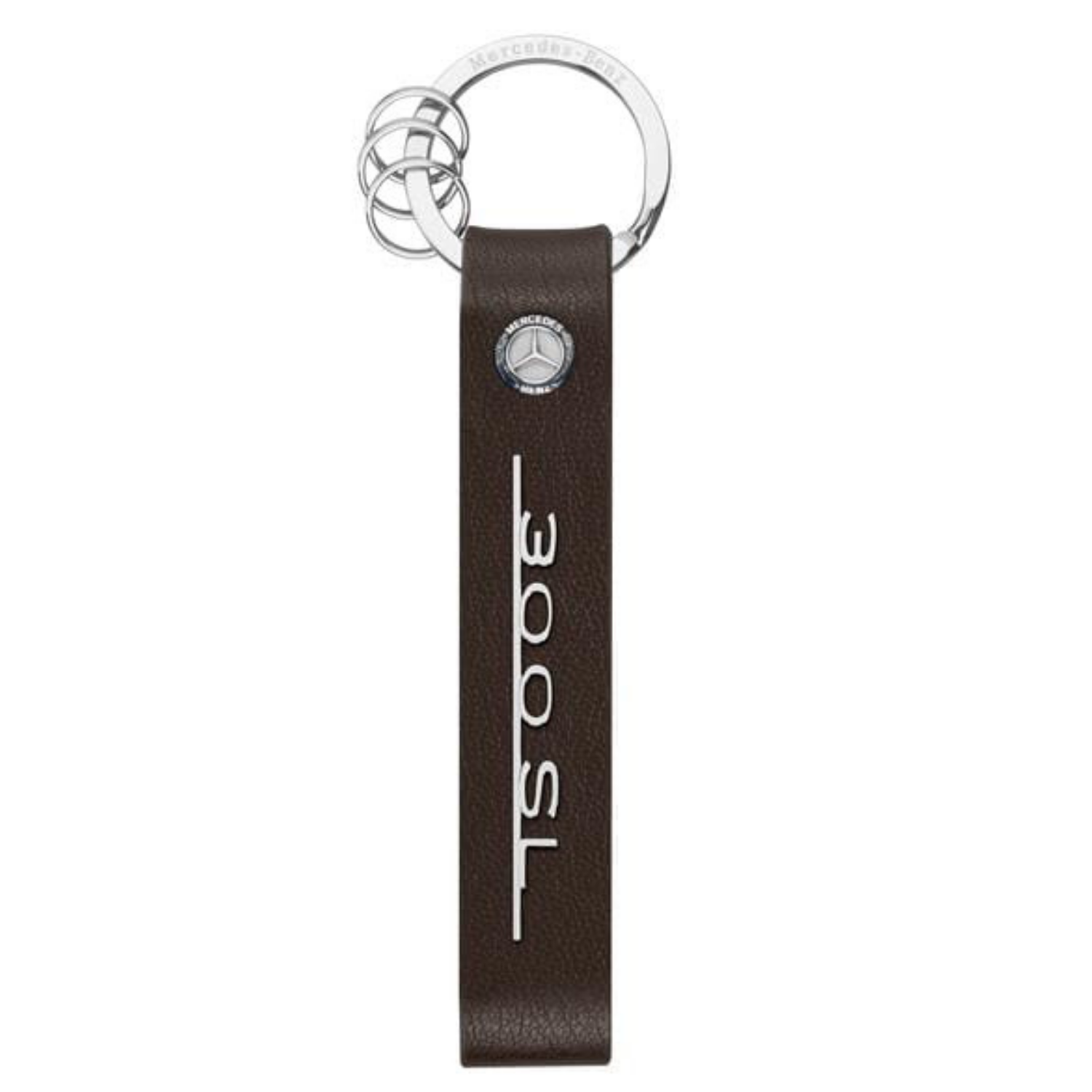 Brelok Mercedes-Benz 300 SL to must have dla każdego miłośnika samochodu Mercedes-Benz 300 SL. Brązowa skóra i polerowana na wysoki połysk stal nierdzewna tworzą elegancki kontrast dla tego sportowego breloczka. Uwage natychmiast przyciąga srebrzysty, vintage napis 300 SL. Nie mogło zabraknąć charakterystycznego logo Mercedes-Benz z trójramienną Gwiazdą – umieszonego ponad napisem 300 SL oraz wygrawerowanej nazwy marki – wzdłuż najwiekszego pierścienia. Brelok ma płaski dzielony pierścień z trzema mini dzielonymi pierścieniami, co ułatwia wyjmowanie lub wymiane poszczególnych kluczy. Do breloka bez problemu przypniesz kluczyk od auta, klucz do domu, roweru, bramy czy jakikolwiek inny, którego potrzebujesz. Pierścienie dzielone wykonane zostały ze stali nierdzewnej, odpornej na korodowanie. Długość breloka to około 12 cm, a jego prostokątny, podłużny kształt ułatwia odszukanie kluczy w torebce czy łatwe wyciągniecie ich z kieszeni.