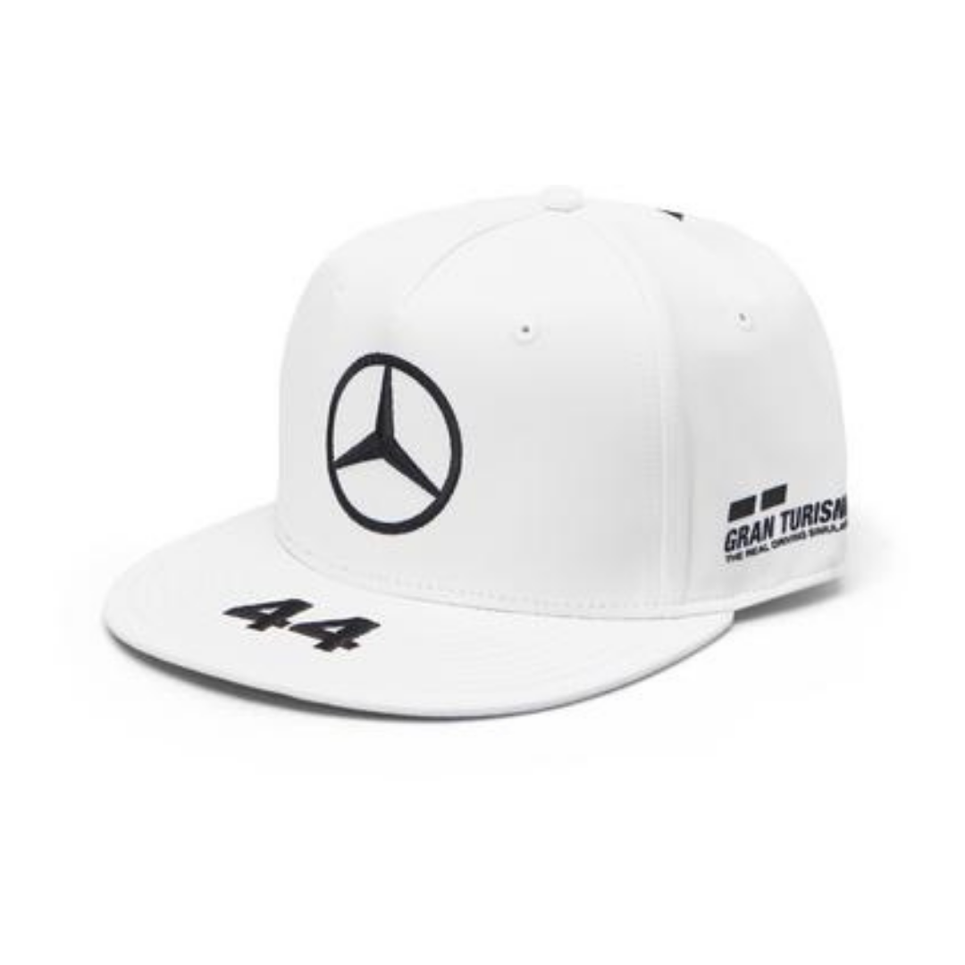 Czapka z płaskim daszkiem, Hamilton. Biała. 100% poliestru. Z płaskim daszkiem. Logo Lewisa Hamiltona Wings i logo sportów motorowych MERCEDES AMG PETRONAS z tyłu. Logo GRAN TURISMO z boku. Logo Monster Energy® na spodzie daszka.