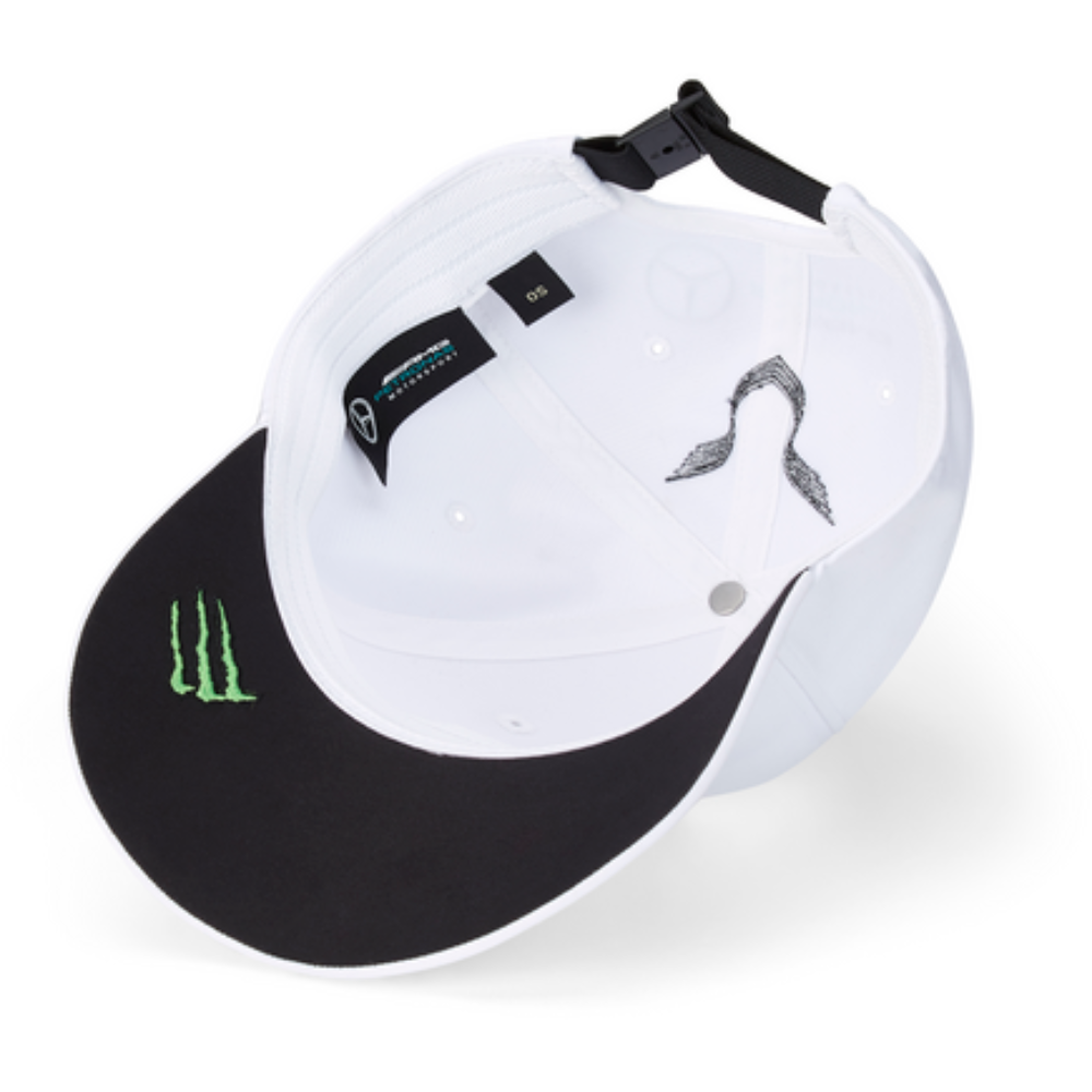 Czapka posiada plastikowe zapięcie umożliwiające indywidualną regulację rozmiaru. Wizualnie nakrycie głowy inspiruje wyhaftowana gwiazda Mercedesa z przodu, wyhaftowane logo „44” na szczycie daszka, a także logo Lewisa Hamiltona i logo MERCEDES AMG PETRONAS MOTORSPORT z tyłu. Projekt czapki doskonale uzupełnia logo GRAN TURISMO z boku i logo Monster Energy® na wewnętrznej stronie daszka.