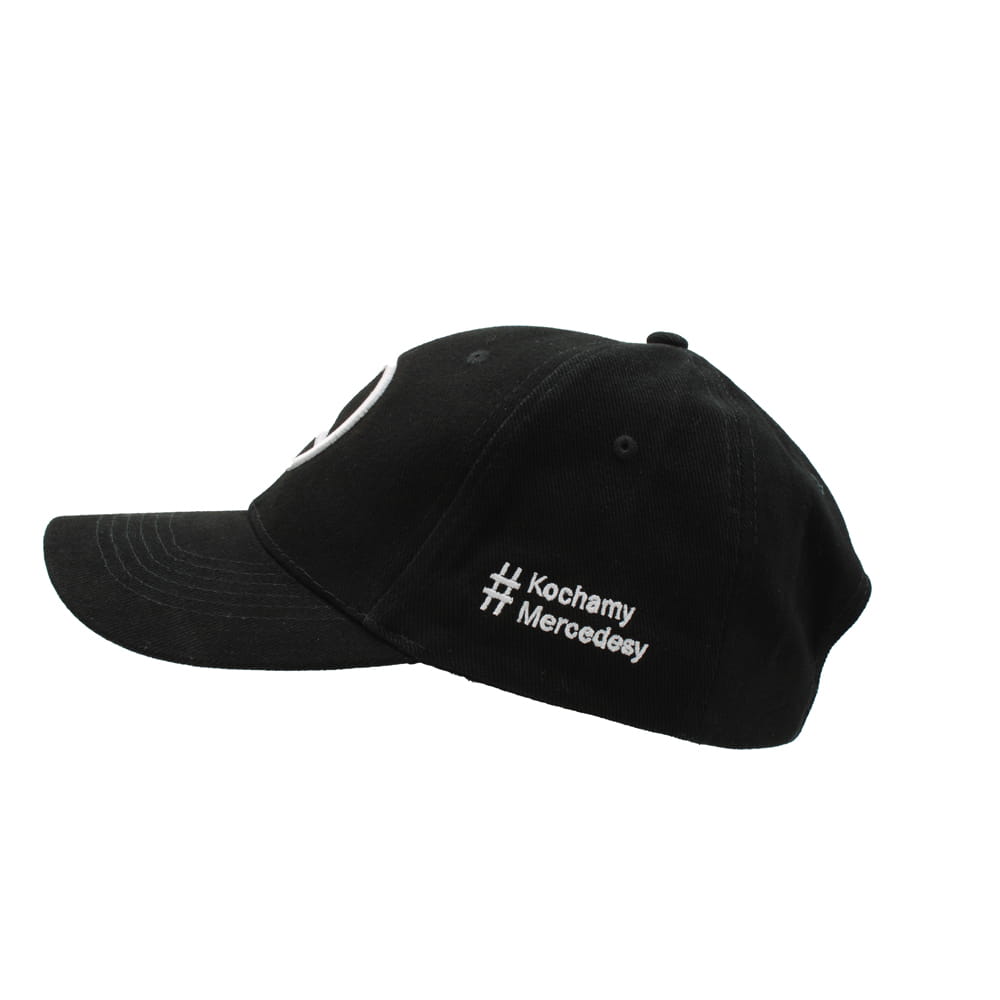 Na przodzie czapki, w formacie 3D i kolorze białym, wyhaftowane jest logo gwiazdy Mercedes-Benz, które dodaje elegancji i prestiżu. Na zapięciu również znajduje się gwiazda Mercedes-Benz, która podkreśla markę i nadaje charakteru. Z lewej strony czapki znajduje się biały napis "#KochamyMercedesy", co sprawia, że czapka staje się jeszcze bardziej unikalna i wyjątkowa.