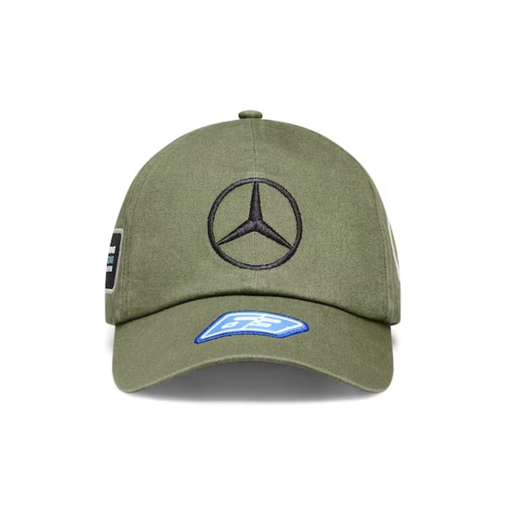 Czapka z daszkiem George Russell została zaprojektowana jako czapka z daszkiem z 6 panelami i oprócz gwiazdy Mercedesa posiada również logo zespołu Mercedes-AMG F1, numer 63 George'a Russella i logo różnych innych partnerów. Zaprojektowana w kolorze ciemnozielonym.
