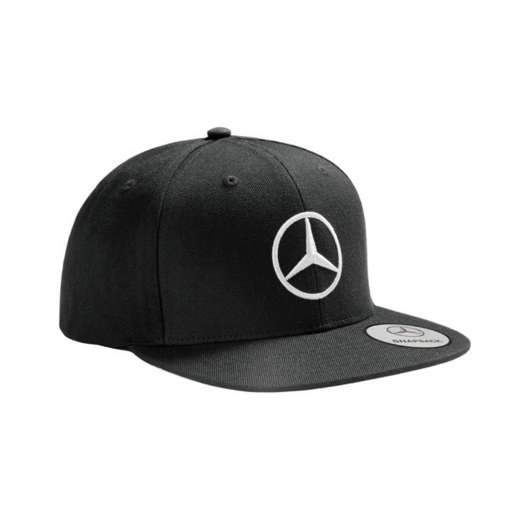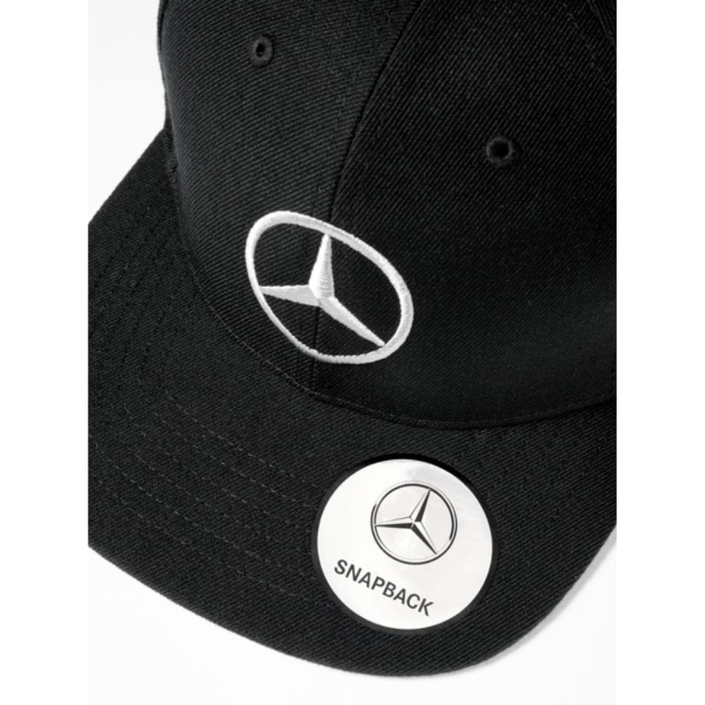 Czapka Mercedes-Benz z poliakrylu i wełny w klasycznej czerni z wyhaftowanym na przedniej ściance srebrnym logo 3D w kolorze srebrno-szarym. Taśma podszewkowa ze srebrnoszarym napisem Mercedes-Benz.Szerokość czapki można regulować za pomocą czarnego plastikowego paska z tyłu.