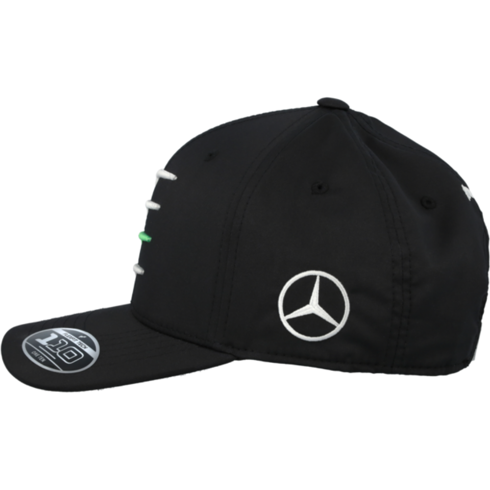 Uzupełnia wygląd i inspiruje jako funkcjonalny dodatek: czarna czapka z daszkiem golfowa zawiera haftowaną gwiazdę Mercedesa.