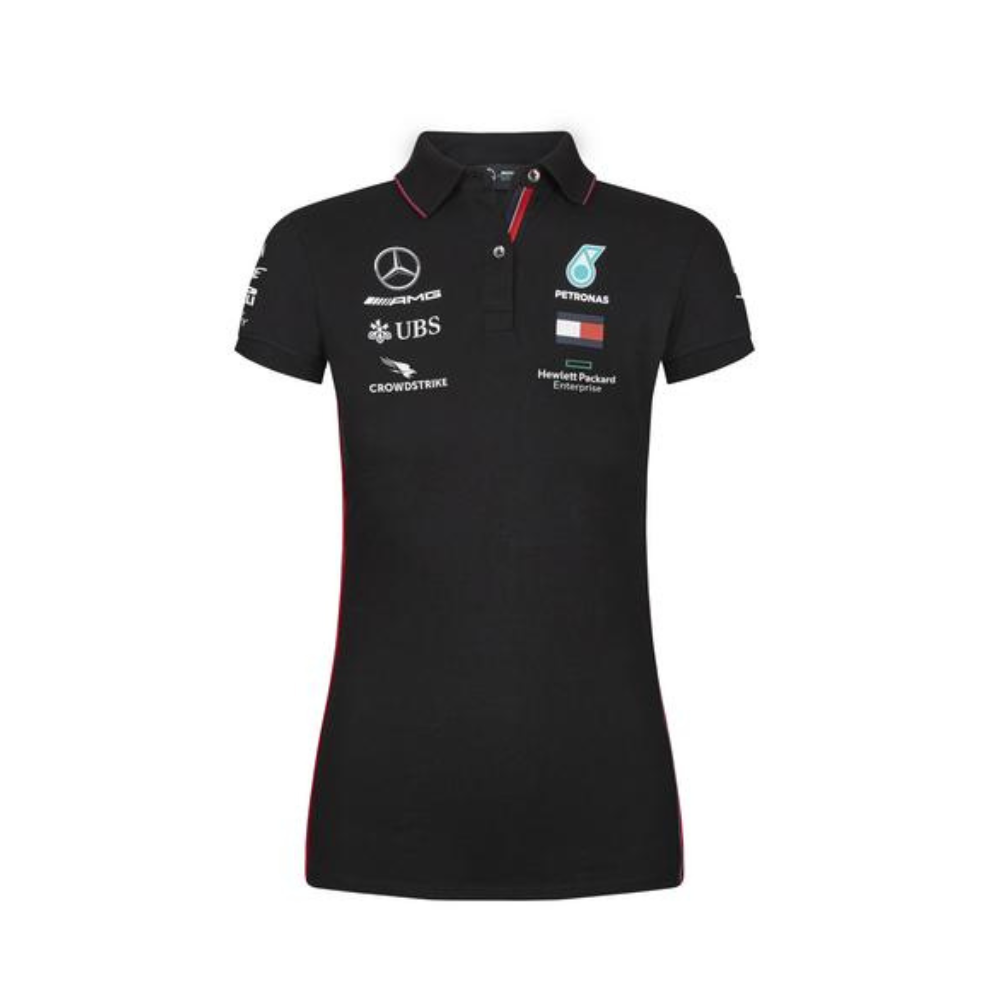 Damska koszulka polo Mercedes-Benz. Oficjalna koszula zespołu Formuły 1 MERCEDES AMG PETRONAS MOTORSPORT na sezon 2020. Rękaw 1/2. Prążkowana tasiemka z boku, przy guzikach i kołnierzyku. Krój slim fit.