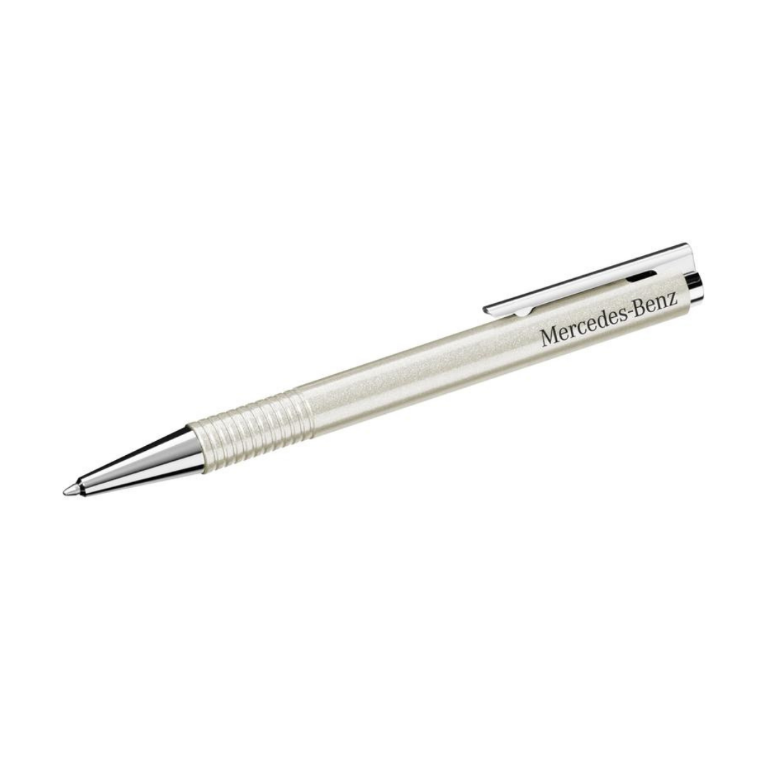 Długopis Mercedes-Benz & Lamy. Obudowa w kolorze lakieru Mercedesa. Tworzywo sztuczne/stal szlachetna. Mechanizm naciskowy. Pisze na czarno. Wymienny, duży wkład LAMY M 16. Srebrne logo Mercedes-Benz wydrukowane na obudowie. W ozdobnym opakowaniu w kształcie probówki.