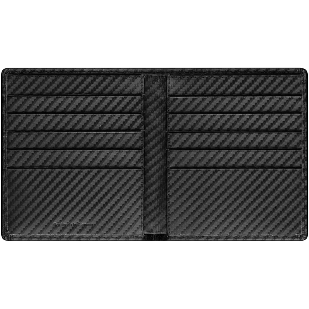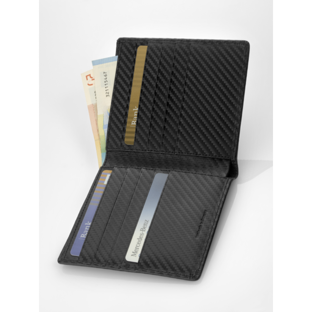 Etui na karty kredytowe AMG Mercedes-Benz. Czarne. Skóra carbon. Różne przegródki na karty i banknoty.