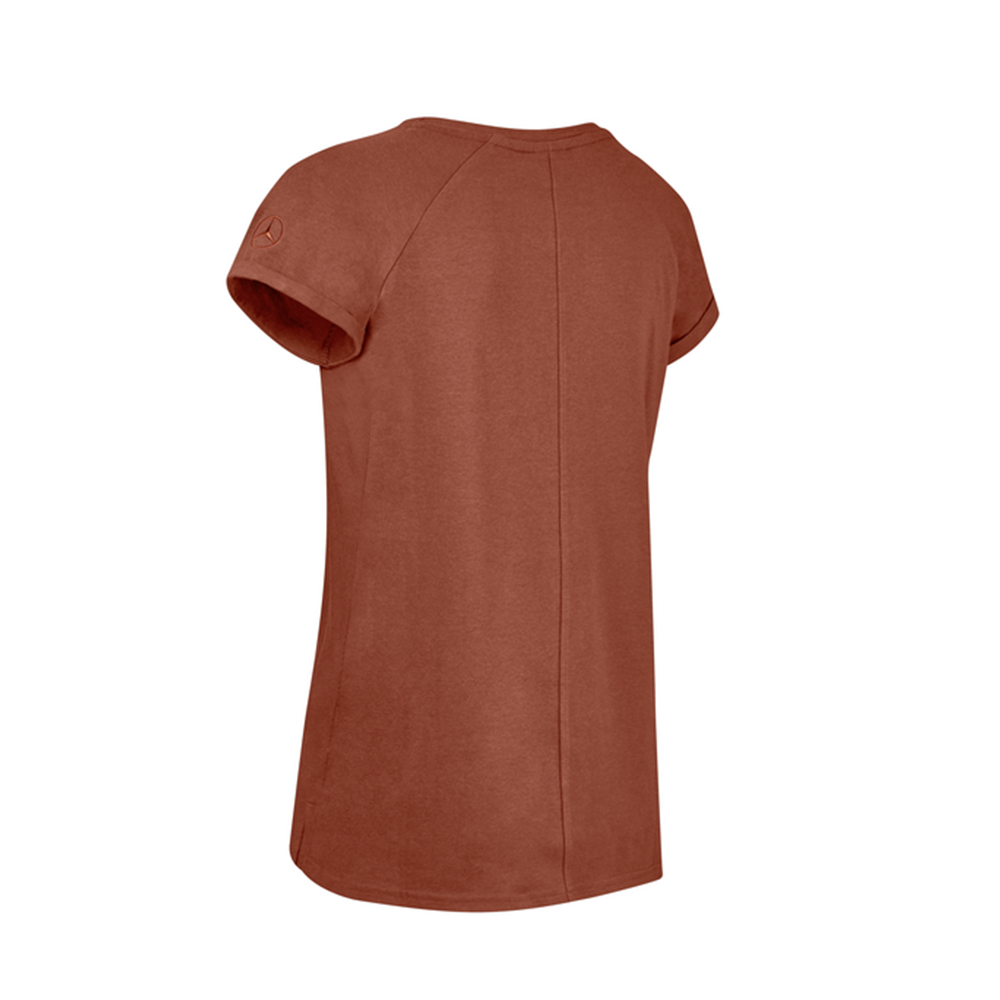 Doskonały wybór na co dzień i czas wolny: damska koszulka w ciemnym odcieniu czerwieni zachwyca nie tylko szerokim okrągłym dekoltem, zaokrąglonym wykończeniem dołu z rozcieczeniami bocznymi oraz tonalnym paskiem na szyi wykonanym z tkaniny powłokowej, ale także wyjątkowym komfortem noszenia. Jednak to nie wszystko - design jest tu równie istotny. Na przykład przód koszulki w nowoczesnym kroju zdobi wzór gwiazdek w odcieniu różowego złota, podczas gdy rękawy uzupełnia tonalna haftowana gwiazda Mercedes. Dodatkowym akcentem są nachodzące na siebie ramiona z krótkimi rękawami i stałym mankietem.