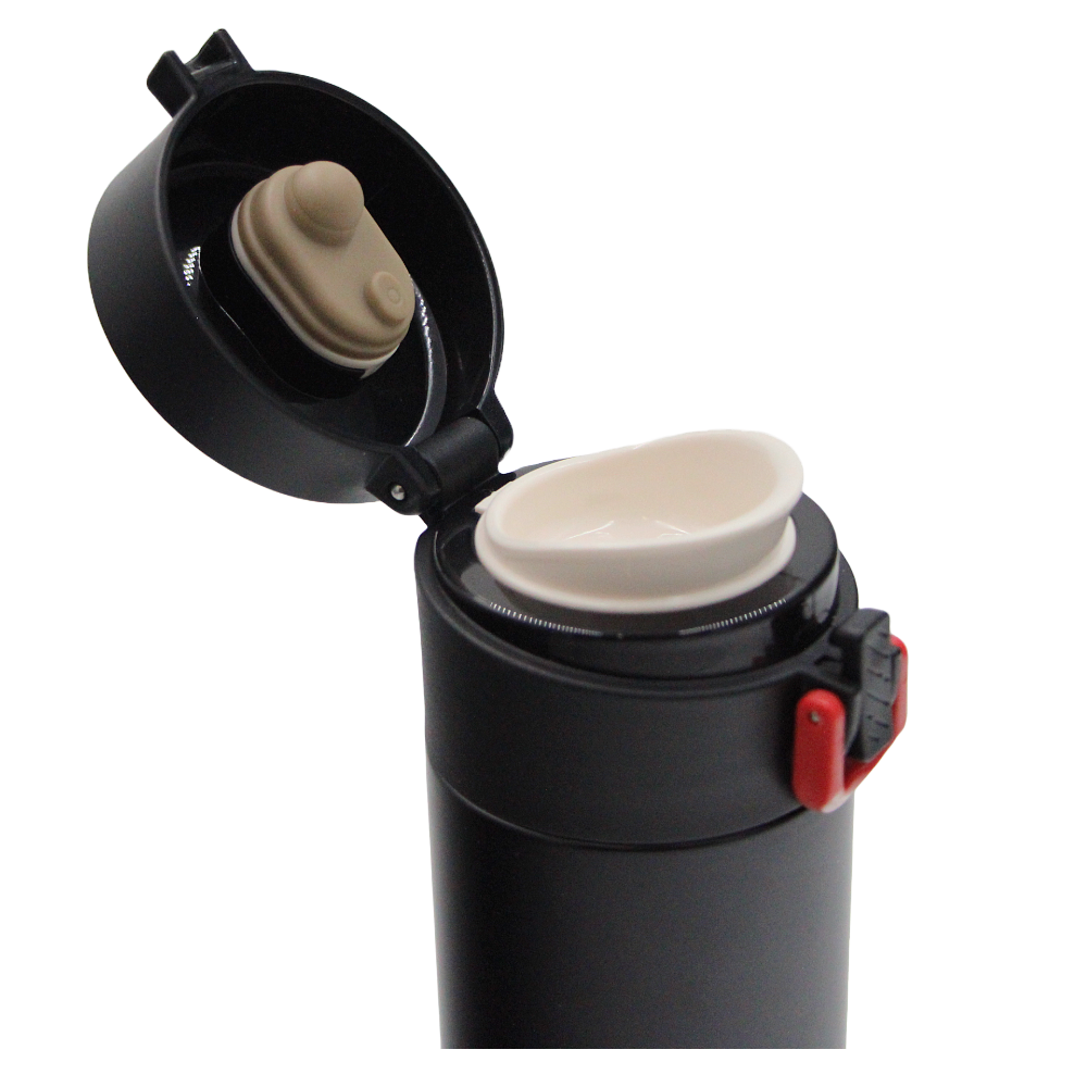 - Zamknięcie kubka wyposażone w system “Keep Open” utrzymuje przykrywkę w stabilnej pozycji, a zamontowana blokada zapobiega przypadkowemu otwarciu kubka.
