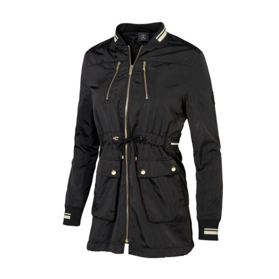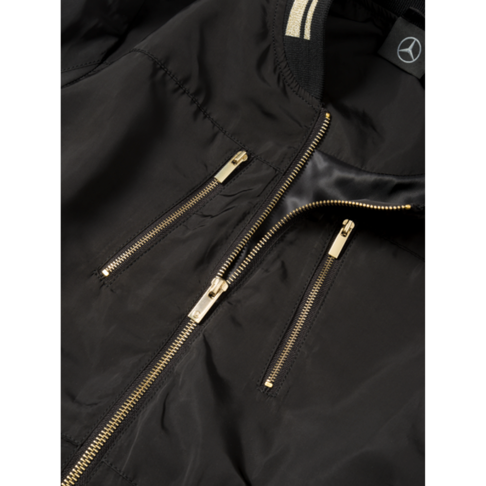 Kurtka damska Mercedes-Benz. Naszyte kieszenie z boku. Kieszenie z przodu na suwak. Pasek do regulowania szerokości talii. Elastyczne wstawki z materiału ryflowanego w obszarze talii. Stojący kołnierz i mankiety wykonane z materiału ryflowanego 1 x 1. Krój modern fit. Wyszywana, delikatna gwiazda Mercedesa na okrągłej aplikacji na lewym rękawie. Czarny ściągacz z wzorem identyfikacyjnym w kolorze złotym po wewnętrznej stronie