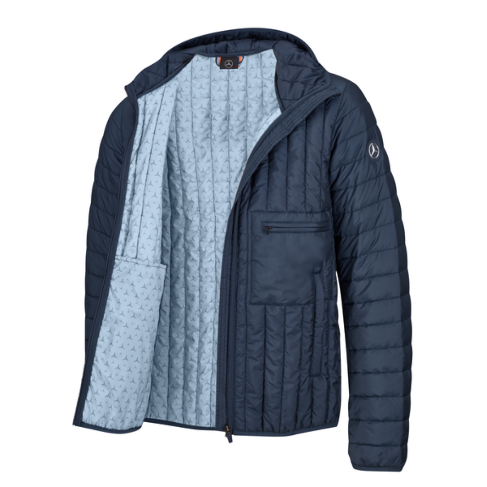 Kurtka męska Mercedes-Benz. Wodoodporna impregnacja DWR. Zamek błyskawiczny Camlock z przodu. Rozmaite kieszenie. Elastyczna lamówka przy kapturze, wykończeniu rękawów i lamówkach. Krój modern fit. Granatowa aplikacja ze srebrną gwiazdą 3D-Mercedes na rękawie.