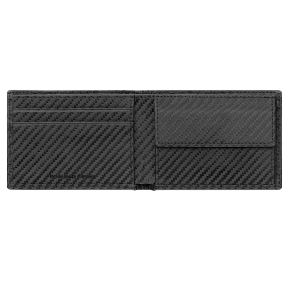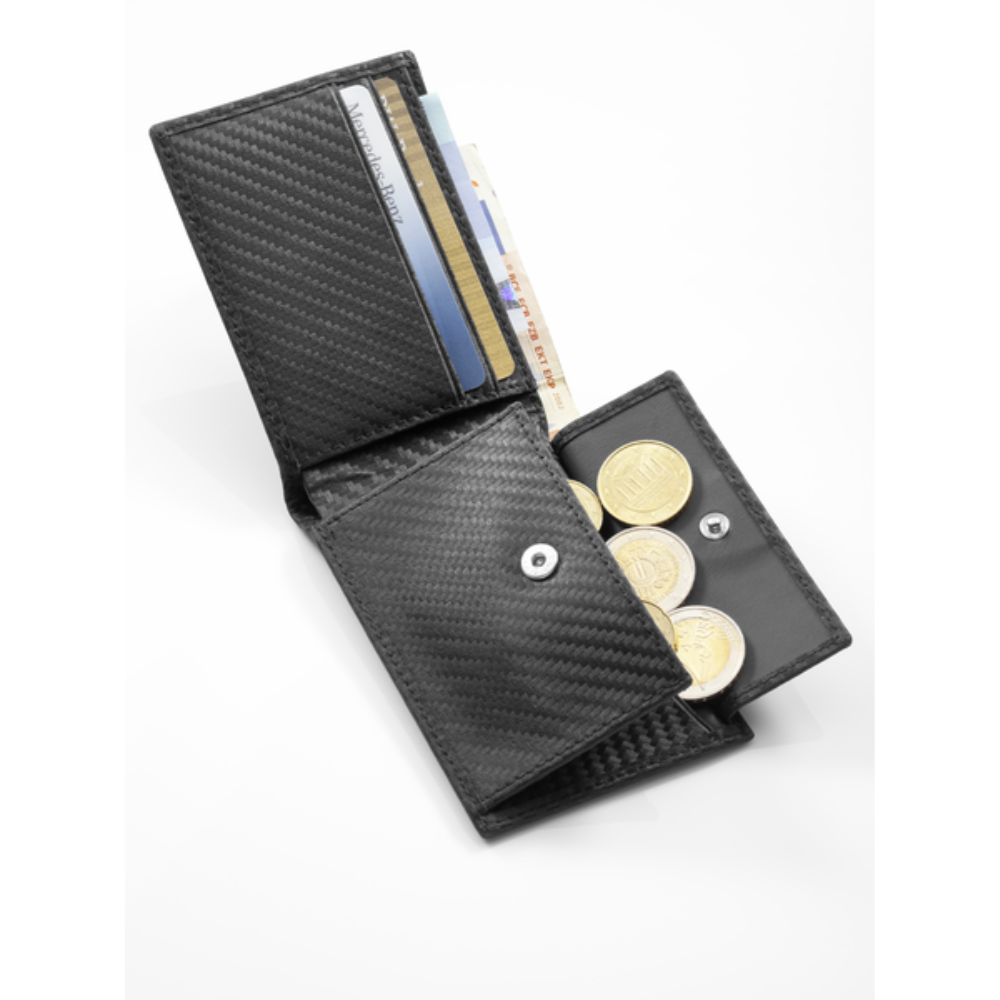 Mały portfel AMG Mercedes-Benz. Czarny. Skóra Carbon. Rozmaite przegródki wewnętrzne.