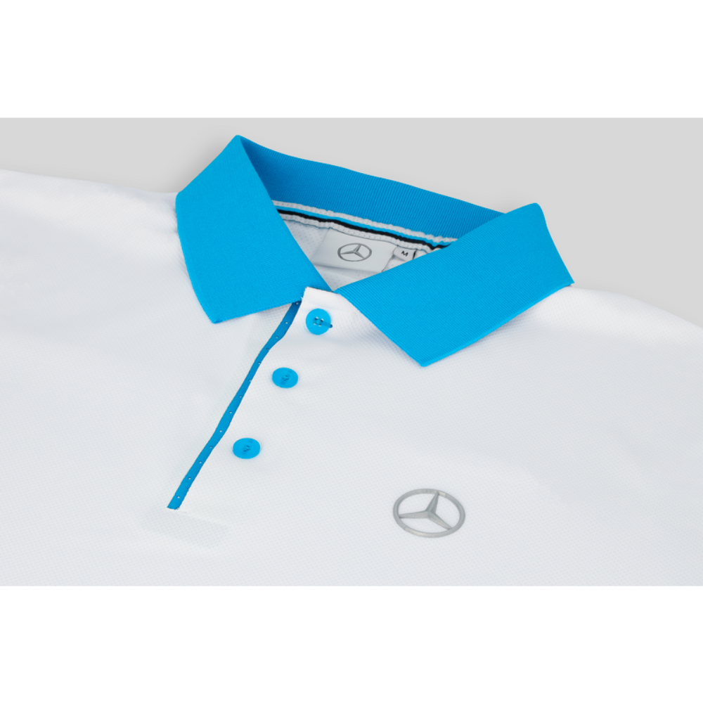 Męska koszulka polo Mercedes-Benz. Regulująca wilgoć dzięki Coolmax® EcoMade. Rękaw wykończony materiałem ryflowanym 1 x 1. Trójkolorowa plisa na karku. Zapinana na guziki. Górna część z tyłu z dzianiną w kształcie rombu, nawiązująca do struktury fotela EQC, dla dodatkowej wentylacji. Krój slim fit.
