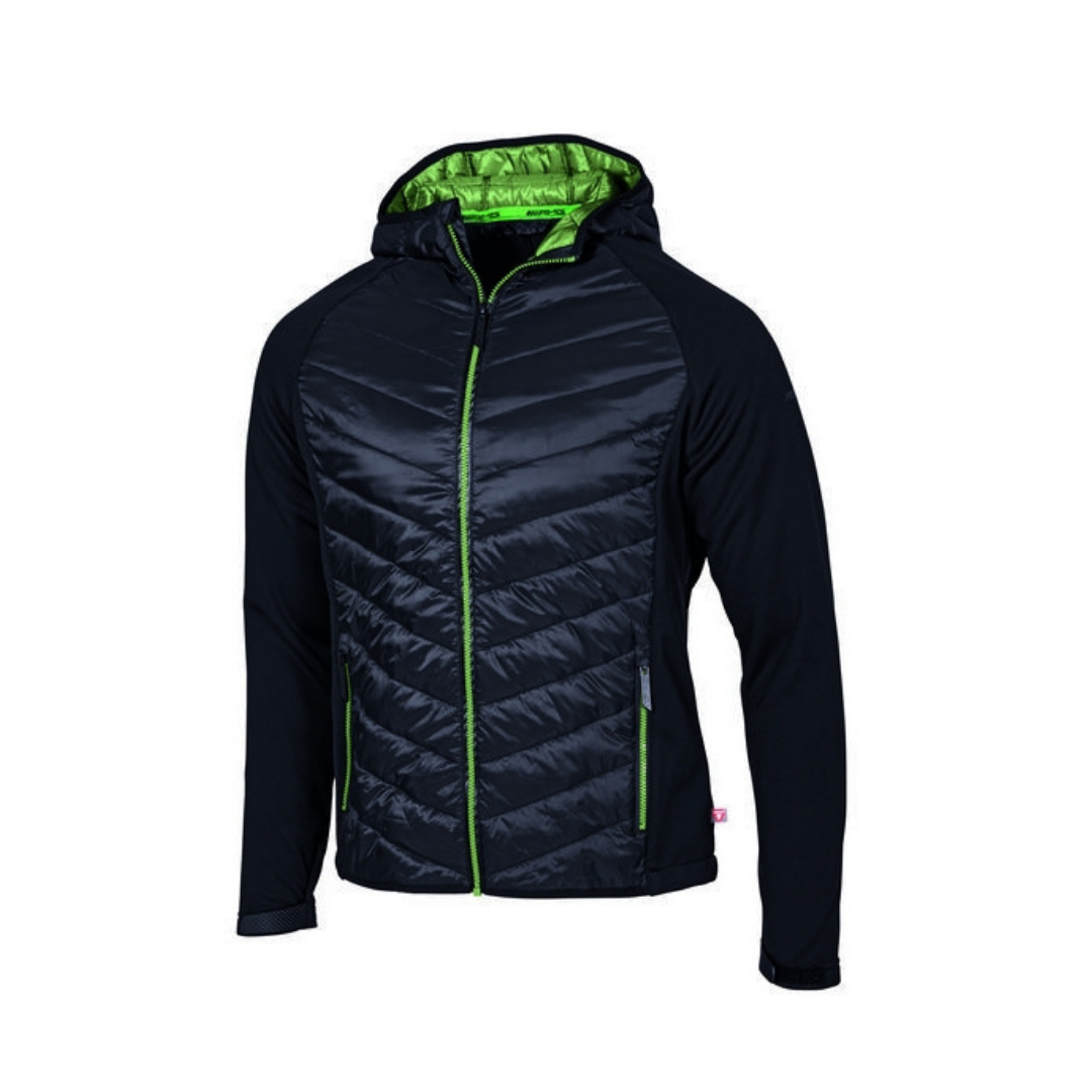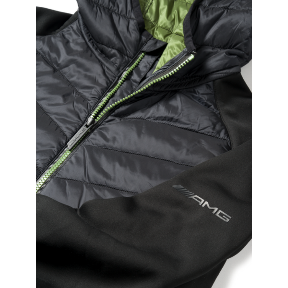 Męska kurtka AMG Hybrid. Materiał wierzchni: Kaptur wewnątrz stebnowany i ocieplany: 100% nylon. Kaptur, kołnierz, rękawy i boczne wstawki z przodu i z tyłu 100% poliester z podszewką polarową o właściwościach zapobiegających mechaceniu. Watowanie: PrimaLoft®. Wysoko zapinana stójka. Kaptur regulowany na szerokość i wysokość. Regulowana długość rękawów. Kieszenie wsuwane boczne. Lightweight. Krój slim fit. Czarne logo AMG 3D nadrukowane na rękawie, zielona wstawka na karku z czarnym logo AMG, nadruk logo AMG wewnątrz przy karku.