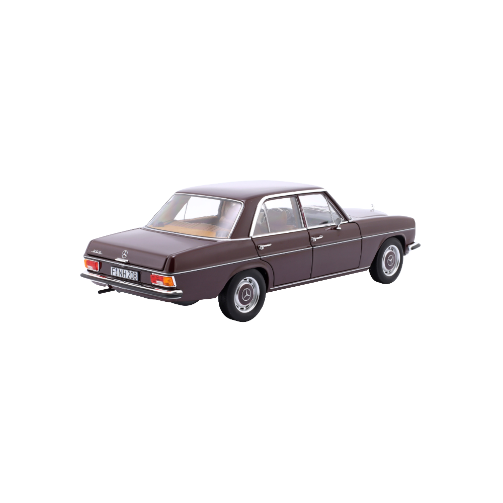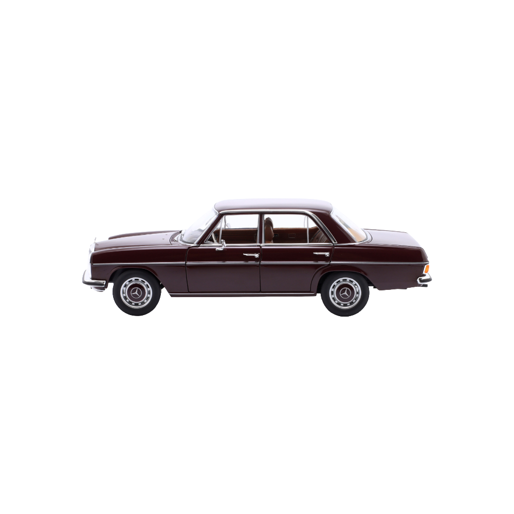 Kolekcjonerski model metalowy z elementami plastikowymi samochodu MERCEDES-BENZ 200 (W115) z roku 1969 w kolorze Ciemnoczerwonym. Model posiada otwierane drzwi, pokrywę silnika oraz bagażnika.