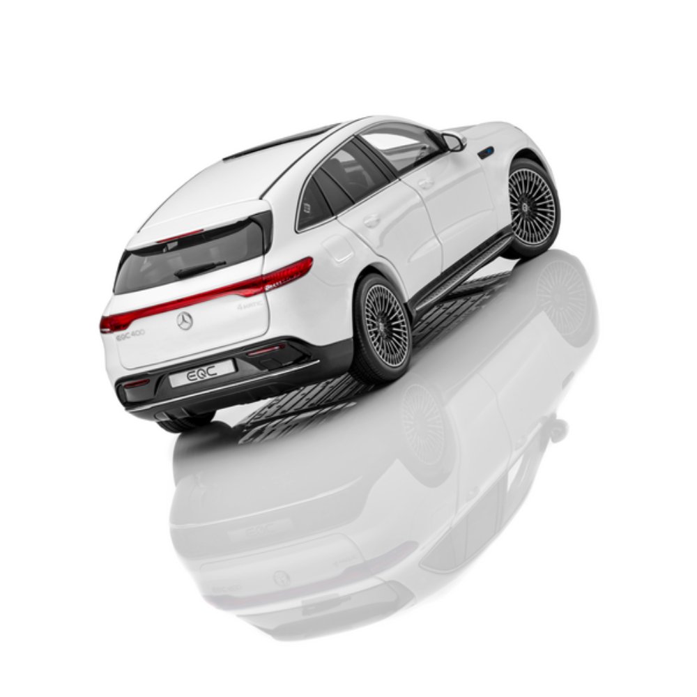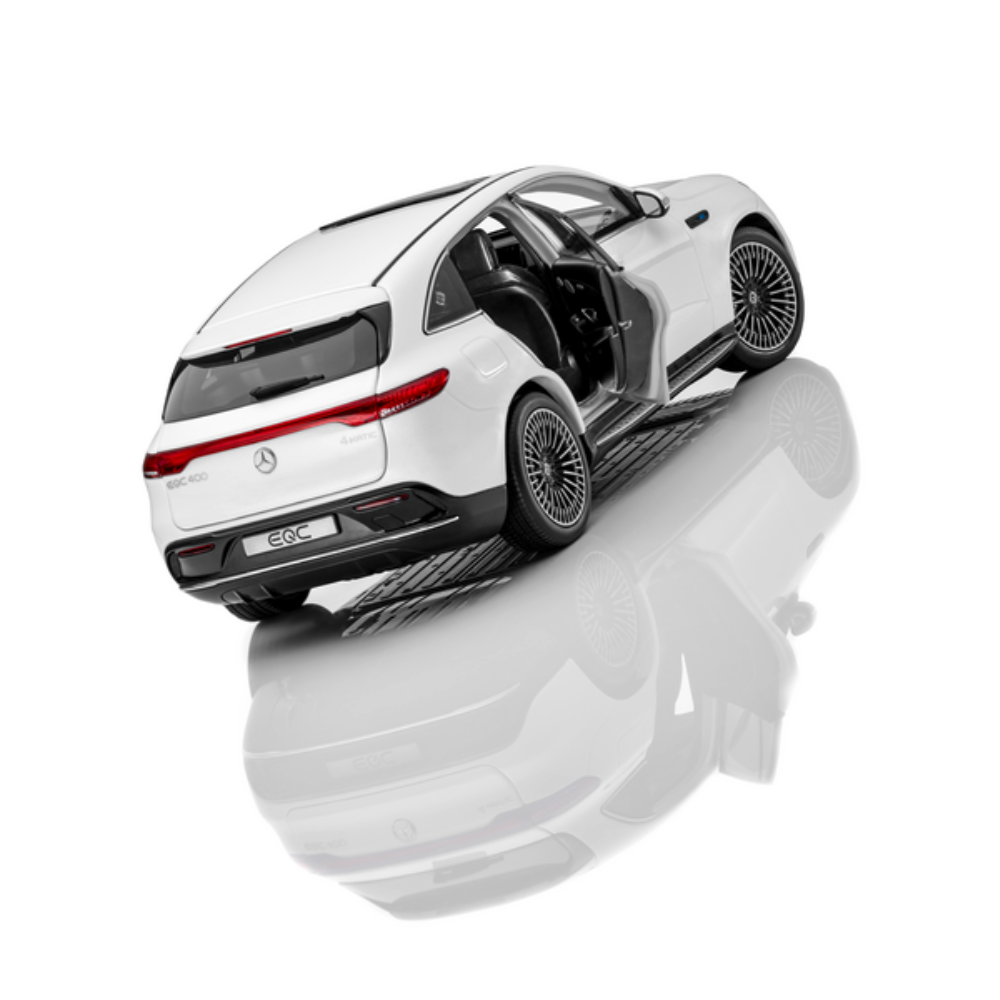 EQC 400 4MATIC Linia zewnętrzna AMG, szklany szyberdach lub 10-ramienne obręcze kół AMG ze stopu metali lekkich 53,3 cm (21 cali): miniaturowy model EQC N293 cechuje się elektromobilnością o najwyższych szczegółach i zgodnie z oryginalnymi danymi CAD. Ten ręcznie składany, precyzyjny model charakteryzuje się autentycznym wykończeniem w odcieniu lakieru, dokładnym odwzorowaniem wszystkich detali wnętrza oraz wysokiej jakości wyściełaną flokiem przestrzenią wewnętrzną i podłogą bagażnika. Wszystkie drzwi i tylną klapę modelu można otworzyć, co pozwala na dokładniejsze obejrzenie wnętrza.