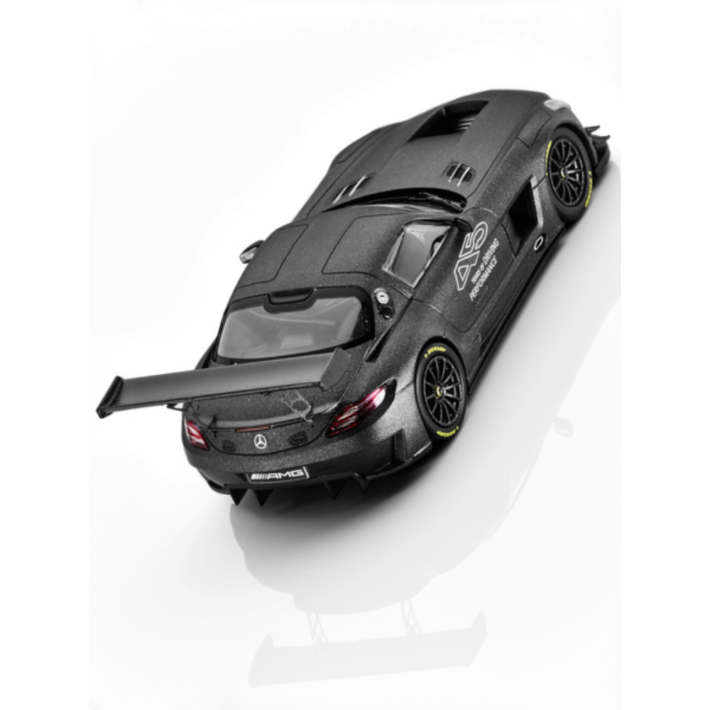 Mercedes-Benz SLS AMG GT3 prezentuje się jako miniaturowy model z odlewu cynkowego i emanuje stylem w każdej kolekcji. Ten model, który został wiernie odwzorowany w szczegółach przy użyciu oryginalnych danych pojazdu, jest wykończony specjalnym lakierem w ramach 45-letniej działalności AMG. Wysokiej jakości detale wnętrza są wiernie odwzorowane. Model dostarczany w pudełku prezentacyjnym w układzie projektowym AMG.