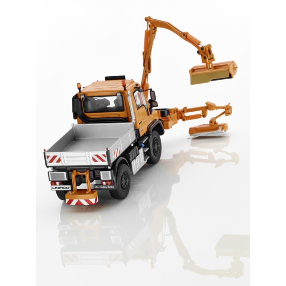 Unimog U430, Euro 6, letni samochód serwisowy, pomarańczowy. Cynk odlewany ciśnieniowo z elementami z tworzywa sztucznego. Skala 1:50. Oryginalne kolory lakieru. Dokładne odwzorowanie. Ręcznie składany precyzyjny model, składający się z ponad 115 pojedynczych części. Szczegółowe wnętrze. Pojazd do prac letnich z kosiarką kombinowaną składającą się z kosiarki z wysięgnikiem przednim i kosiarki do poboczy. Firma NZG dla Mercedes-Benz.