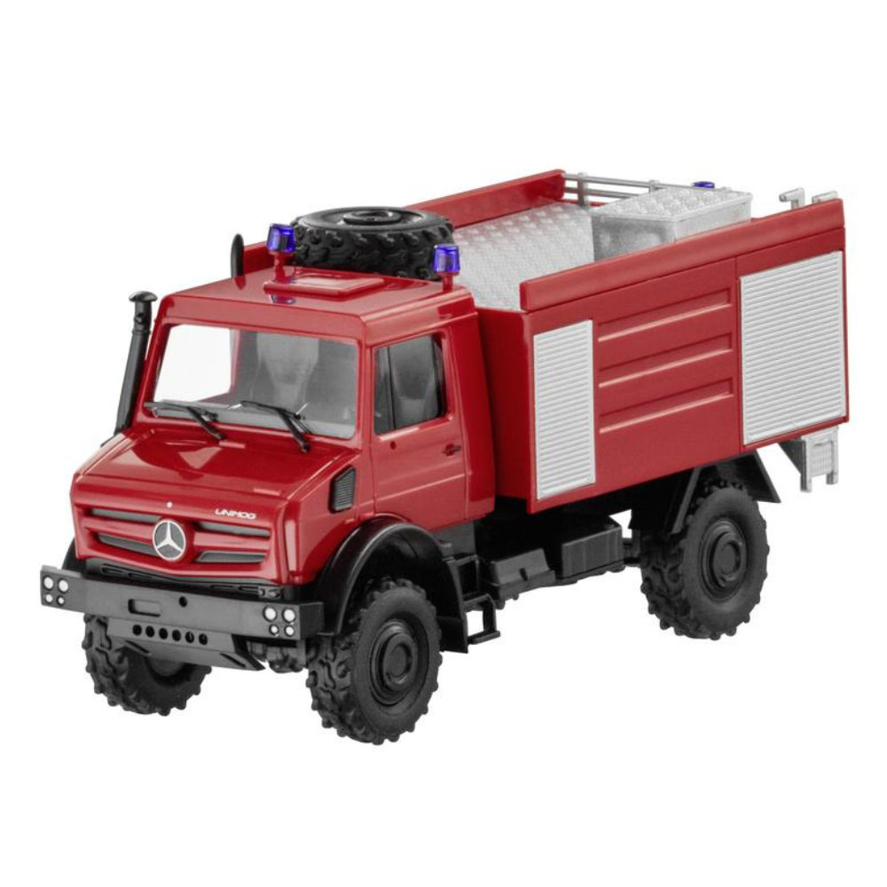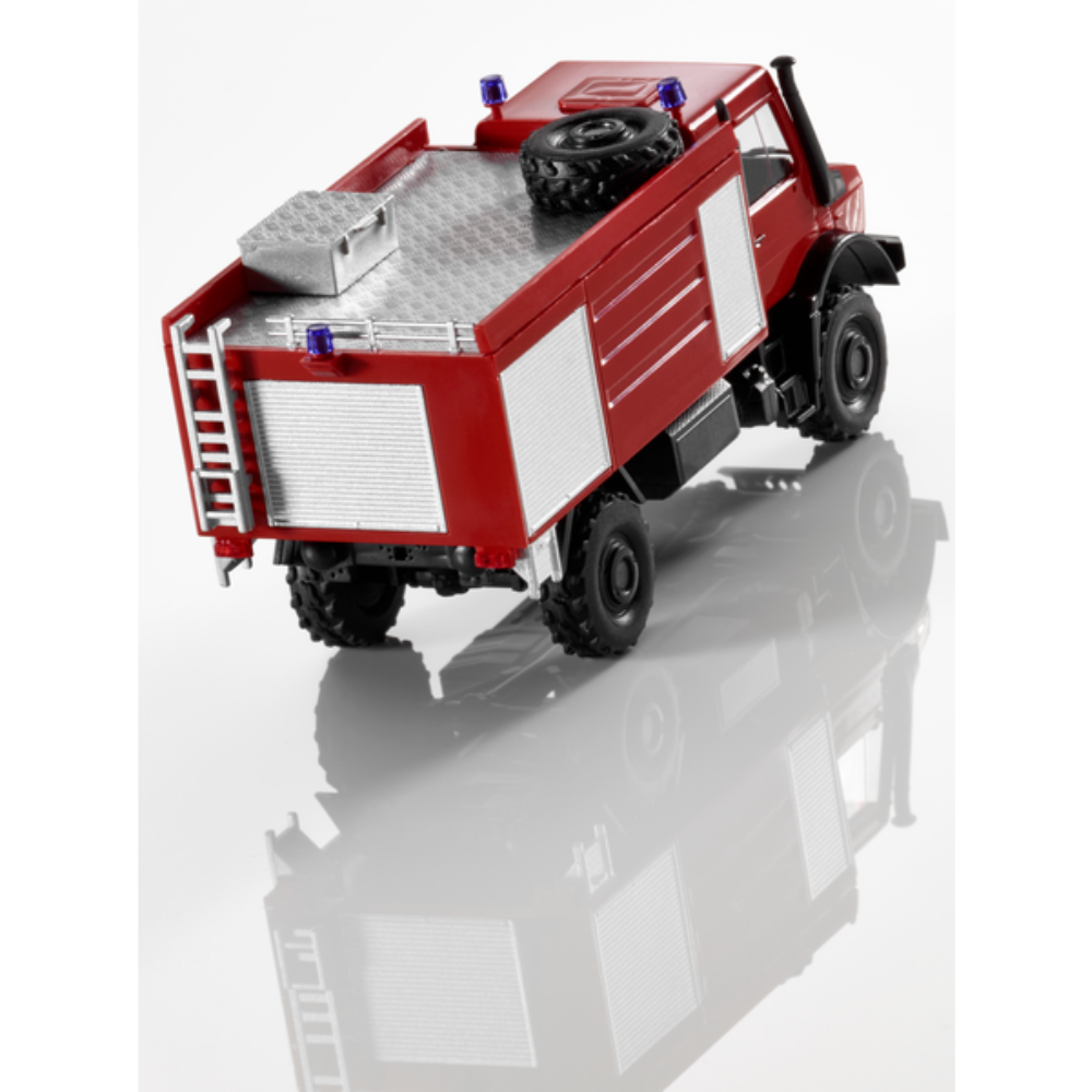 Unimog U5023, straż pożarna. Plastikowy. Skala 1:87. Oryginalny kolor lakieru. Dokładne odwzorowanie. Ręcznie składany precyzyjny model, składający się z ponad 66 pojedynczych części. Szczegółowe wnętrze. Firma Busch dla Mercedes-Benz.