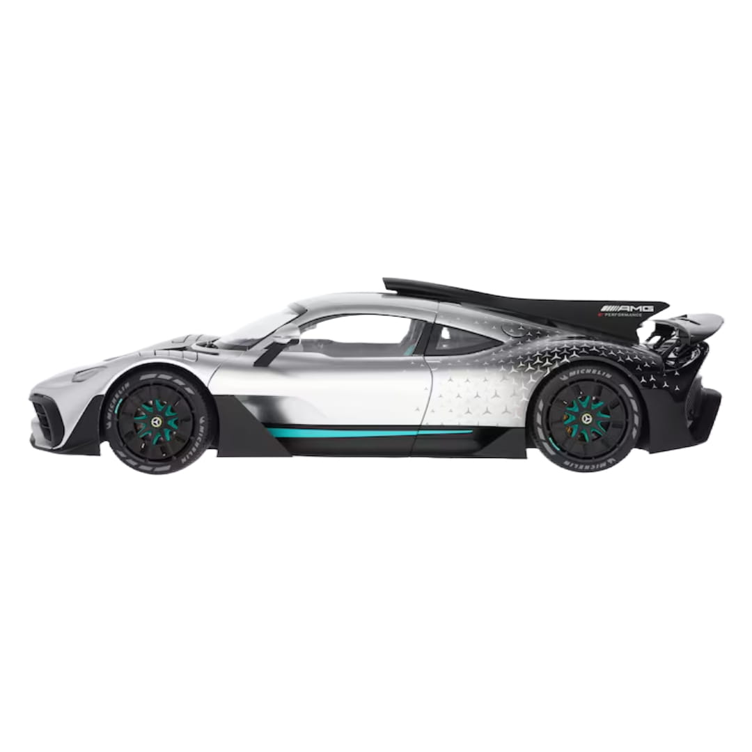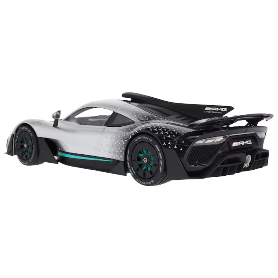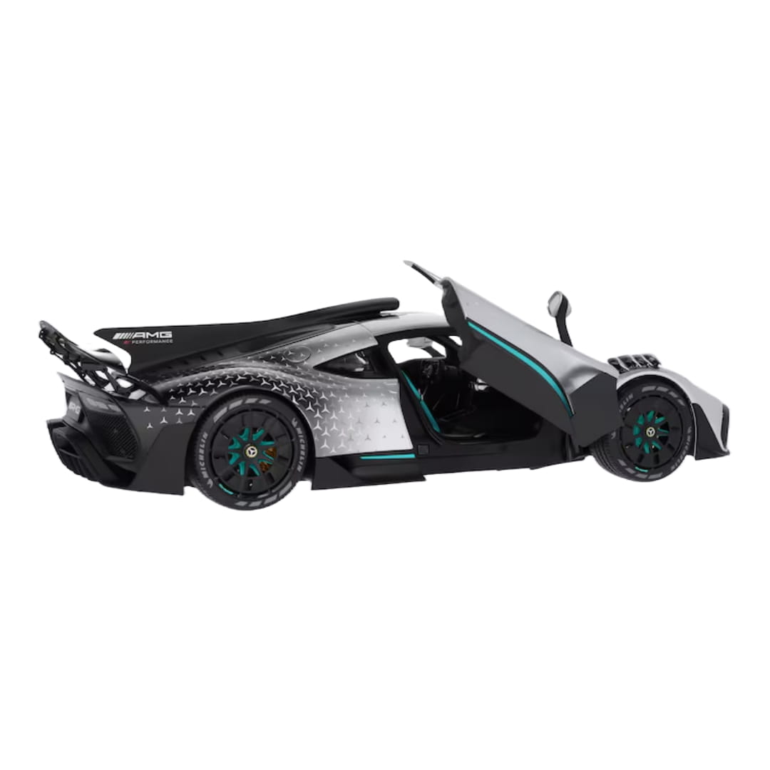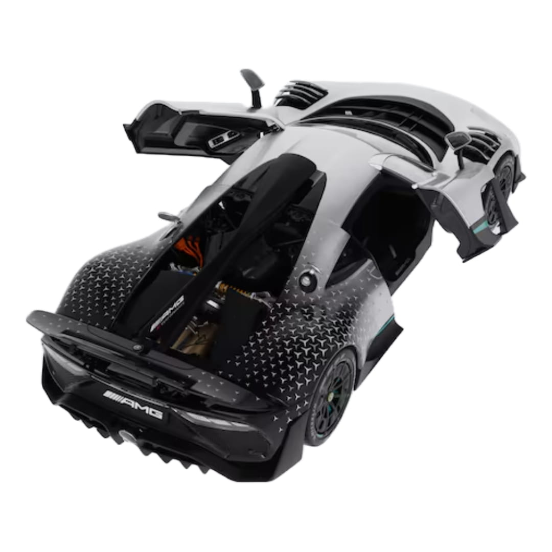 Sportowa jazda w najczystszej postaci – to właśnie oznacza Mercedes-AMG ONE. Nowoczesny samochód wyścigowy z dopuszczeniem do ruchu drogowego inspirowany jest Formułą 1 i z pewnością zachwyci niesamowitymi osiągami. Hybryda plug-in E PERFORMANCE z klasy premium może pochwalić się turbodoładowanym silnikiem benzynowym V6 o pojemności 1,6 litra i czterema silnikami elektrycznymi obsługującymi turbosprężarkę, wał korbowy i przednią oś, co łącznie daje jej systemową moc 1063 KM. Niepowtarzalna moc i wyjątkowe właściwości jezdne: dzięki modelowi samochodu Mercedes-AMG ONE C298 legenda może teraz stać się częścią Twojej domowej kolekcji. Stworzony przy użyciu oryginalnych danych CAD z maksymalną dbałością o szczegóły, precyzyjny model jest nie tylko wykończony w autentycznym kolorze lakieru, ale także dokładnie odwzorowuje szczegóły wnętrza. Drzwi kierowcy i drzwi pasażera z przodu można otworzyć, co pozwala na bliższą inspekcję wnętrza samochodu. Można również przesuwać różne części modelu samochodu. Można na przykład otwierać i zamykać pętle na błotnikach, zdejmować panele komory silnika, wysuwać tylny spojler, otwierać klapkę wlewu paliwa i klapkę ładowania mocy, a także przesuwać klapy wentylacyjne pod podłogą. Model samochodu jest dostarczany w opakowaniu Mercedes-AMG i zawiera śrubokręt ułatwiający wyjmowanie oraz rękawicę chroniącą szyby i lakier przed odciskami palców.