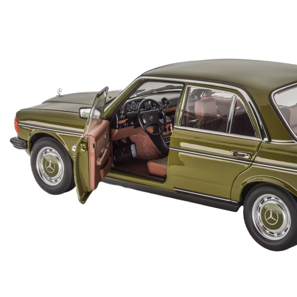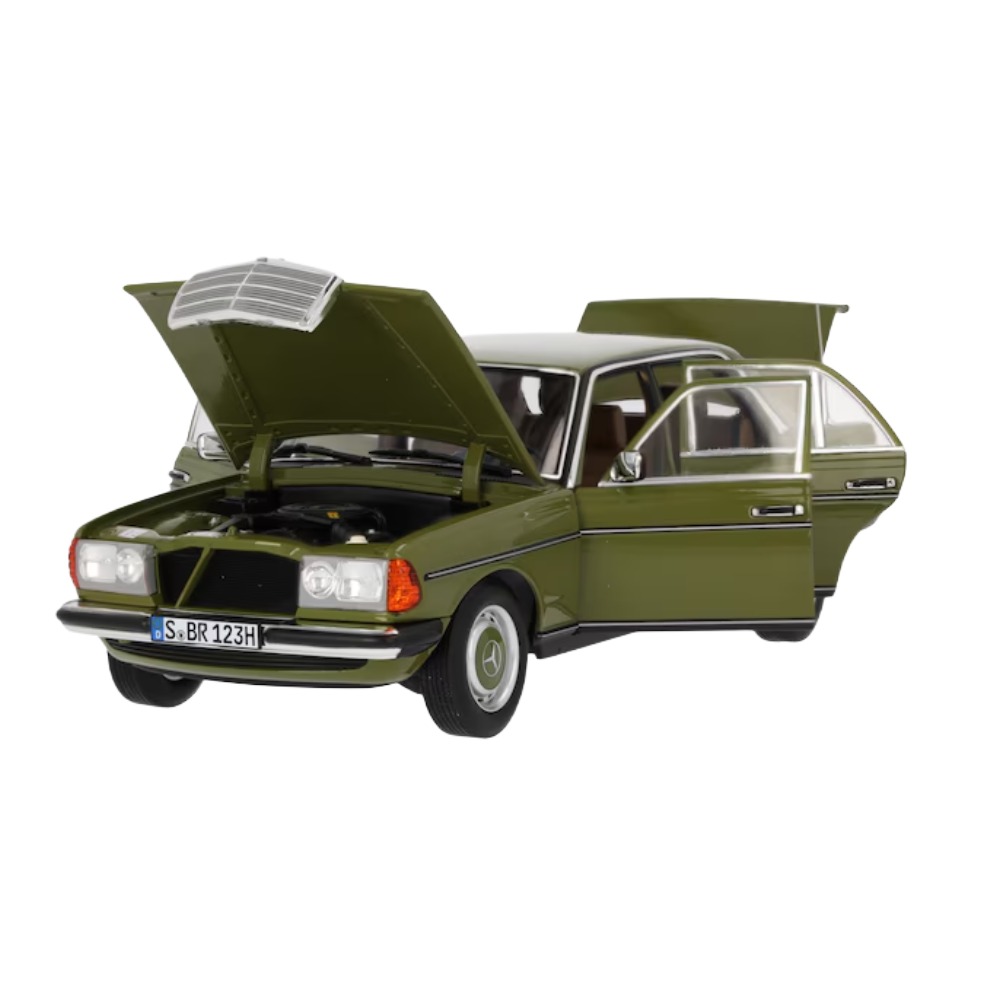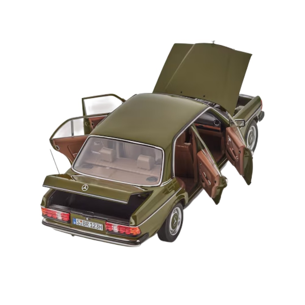 Dziesięć lat produkcji, prawie 2,7 miliona pojazdów: jako następca modeli "kreska-osiem", W123 wyznaczał standardy w sferze bezpieczeństwa dla samochodów klasy średniej. Podobnie jak wielki pierwowzór, miniaturowy model W123 imponuje ogromną dbałością o szczegóły. Ręcznie montowany, precyzyjny model jest nie tylko polakierowany w autentycznym odcieniu koloru, ale ma również wiernie odwzorowanie wszystkich detali wnętrza. Drzwi, pokrywę komory silnika i pokrywę bagażnika modelu można otwierać, co pozwala lepiej obejrzeć wnętrze. Miniatura jest dostarczana w opakowaniu Mercedes-Benz Classic, zawierającym również wkrętak do łatwego demontażu. W zestawie znajduje się również rękawiczka, pozwalająca chronić model przed odciskami palców na szybach i lakierowanym nadwoziu.