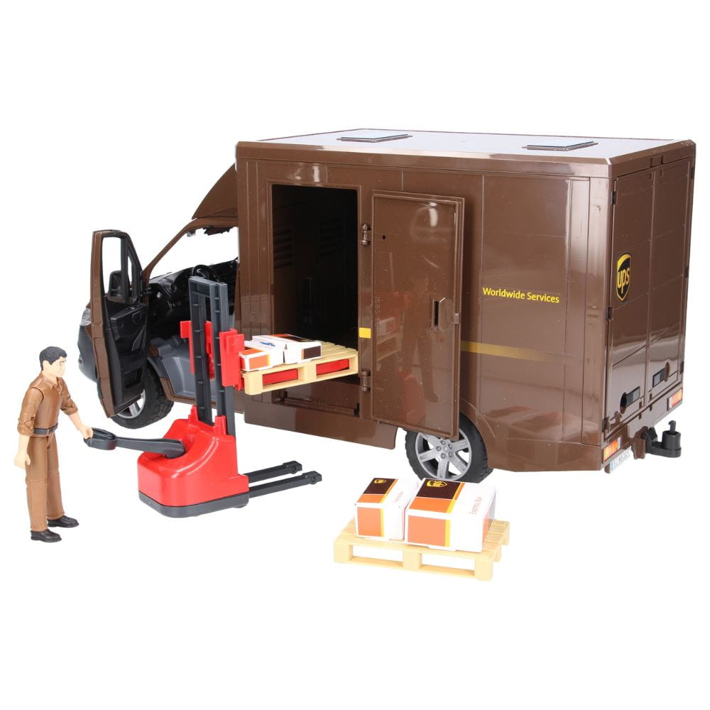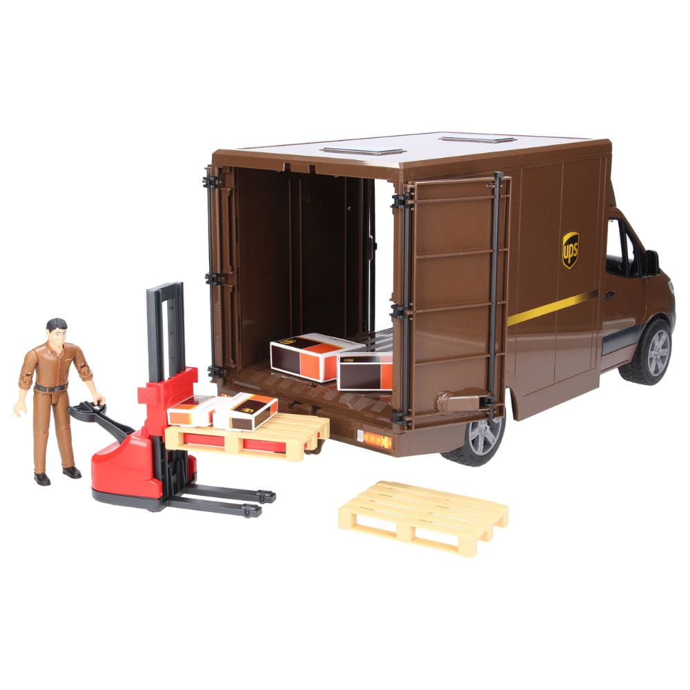 Model posiada otwierane tylne drzwi dzielone na dwie części, umożliwiające pełny dostęp do przestrzeni ładunkowej. Dodatkowe boczne drzwi ułatwiają szybkie wyjmowanie mniejszych przesyłek. W zestawie znajduje się ręczny wózek paletowy oraz dwie europalety, dzięki którym można wygodnie załadować lub rozładować cięższe paczki. Figurka kuriera ubrana jest w charakterystyczny uniform UPS, a do kompletu dołączono realistyczne kartony w różnych rozmiarach.