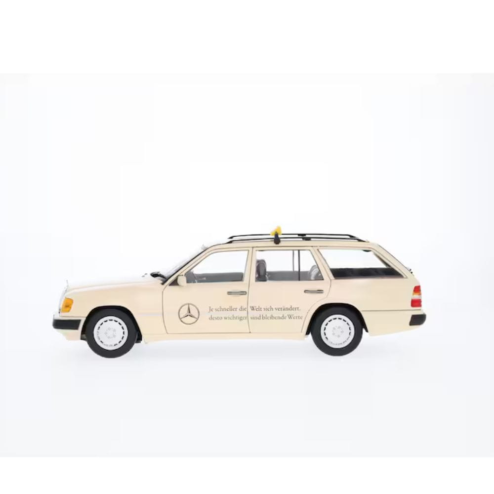 Modele Kombi drugiej generacji, które po raz pierwszy zaprezentowano na IAA – największych na świecie międzynarodowych targach motoryzacyjnych we Frankfurcie nad Menem w Niemczech – w 1985 roku, nie tylko cieszyły się dużą popularnością wśród osób prywatnych, ale były również często wykorzystywane jako taksówki . Podobnie jak ich poprzednicy, nowe modele Kombi również produkowane były w fabryce w Bremie, która w tym momencie przestawiła się już całkowicie na produkcję samochodów osobowych. Zaledwie kilka lat później, we wrześniu 1989 roku, producent samochodów zaprezentował na IAA – największych na świecie międzynarodowych targach motoryzacyjnych we Frankfurcie nad Menem w Niemczech całkowicie odnowiony program modeli klasy średniej, który obejmował głównie zmiany stylistyczne. Przykładowo to głównie listwy boczne wyróżniały nowe modele na tle poprzedników. Jako model miniaturowy, 300 D S 124 Kombi również robi ogromne wrażenie, a wszystkie jego szczegóły są w pełni oparte na większym modelu do naśladowania. Wierna kopia zdobionego i flokowanego wnętrza sprawia, że serca kolekcjonerów biją szybciej, podobnie jak sześć części, które w modelu 1:18 można otworzyć (drzwi, tylna klapa i maska). Szczególną atrakcją jest tutaj również wykończenie lakiernicze w autentycznym odcieniu koloru: po stronie kierowcy i pasażera z przodu nadrukowana jest gwiazda z napisem „Im szybciej zmienia się świat, tym ważniejsze są trwałe wartości”. Precyzyjny model, złożony ręcznie z ponad 118 pojedynczych części, dostarczany jest w opakowaniu Mercedes-Benz Classic. W zestawie znajduje się również śrubokręt i rękawiczka, które chronią model przed odciskami palców podczas jego zdejmowania.