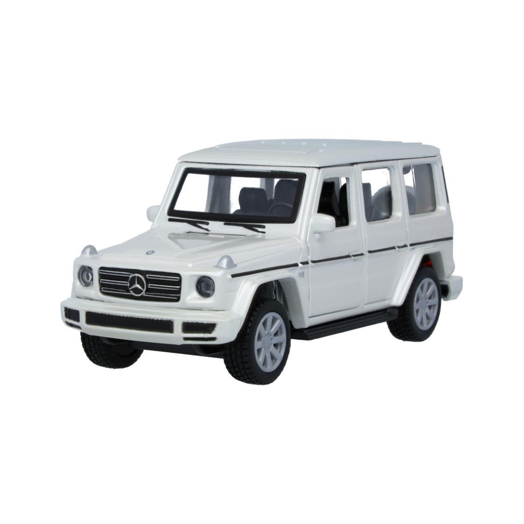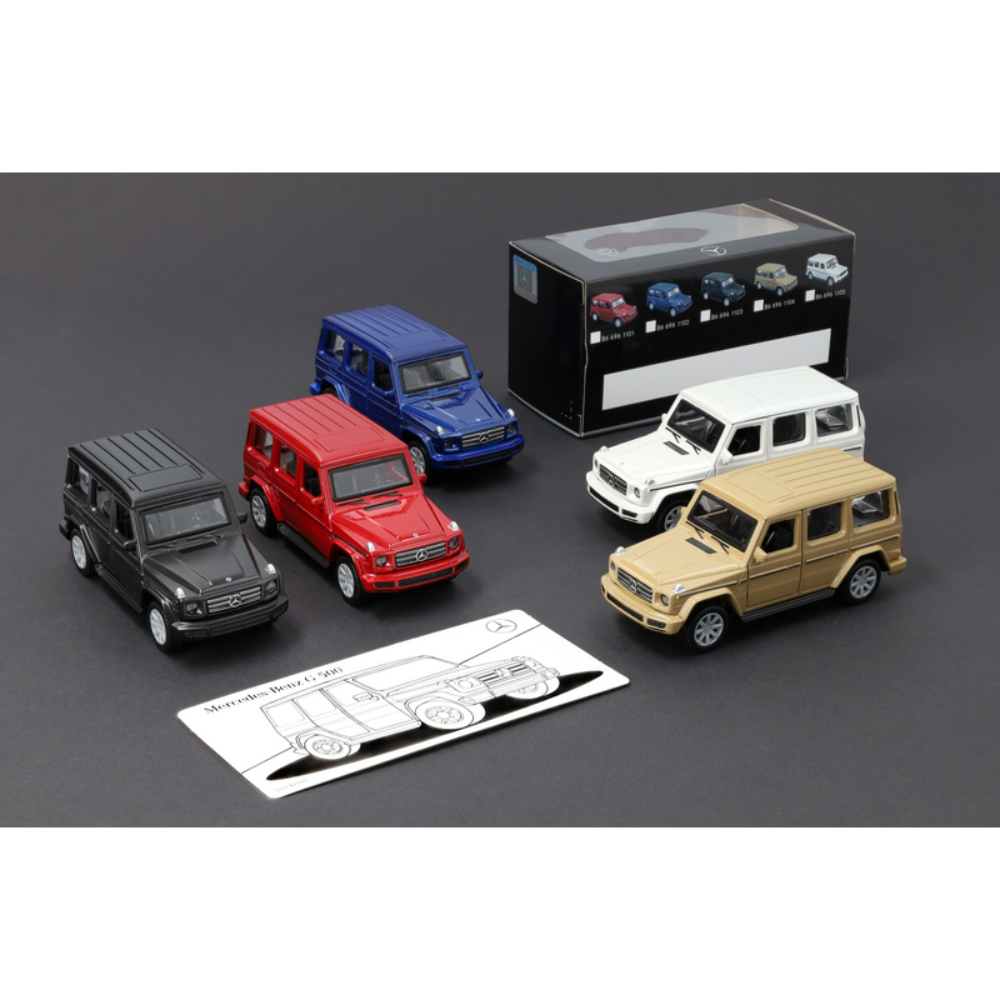 Zabawka dla dzieci Mercedes-Benz G 500 AMG Line dla małych miłośników samochodów. Drzwi kierowcy i pasażera z przodu oryginalnie pomalowanego pojazdu otwierają się, aby umożliwić zajrzenie do środka. Zabawka posiada również funkcję pullback: wystarczy odciągnąć samochodzik i natychmiast wystrzeli do przodu. Samochód dostarczany jest w opakowaniu przedstawiającym całą serię. Pod różnymi wariantami kolorystycznymi znajduje się z tyłu pole, które zapewnia miejsce na indywidualny tekst. Mapa do koloru, która pojawia się na opakowaniu po wyjęciu pojazdu.