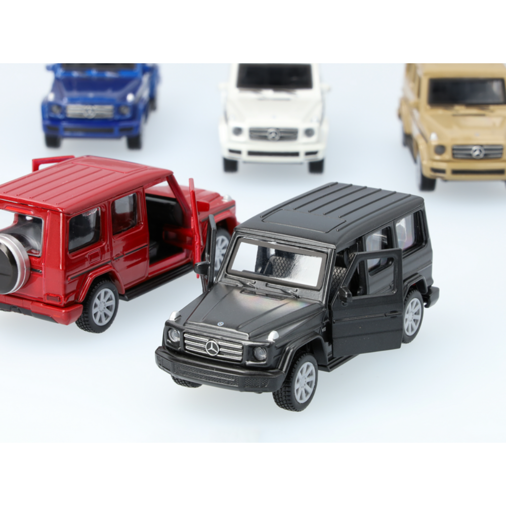 Zabawka dla dzieci Mercedes-Benz G 500 AMG Line dla małych miłośników samochodów. Drzwi kierowcy i pasażera z przodu oryginalnie pomalowanego pojazdu otwierają się, aby umożliwić zajrzenie do środka. Zabawka posiada również funkcję pullback: wystarczy odciągnąć samochodzik i natychmiast wystrzeli do przodu. Samochód dostarczany jest w opakowaniu przedstawiającym całą serię. Pod różnymi wariantami kolorystycznymi znajduje się z tyłu pole, które zapewnia miejsce na indywidualny tekst. Mapa do koloru, która pojawia się na opakowaniu po wyjęciu pojazdu.