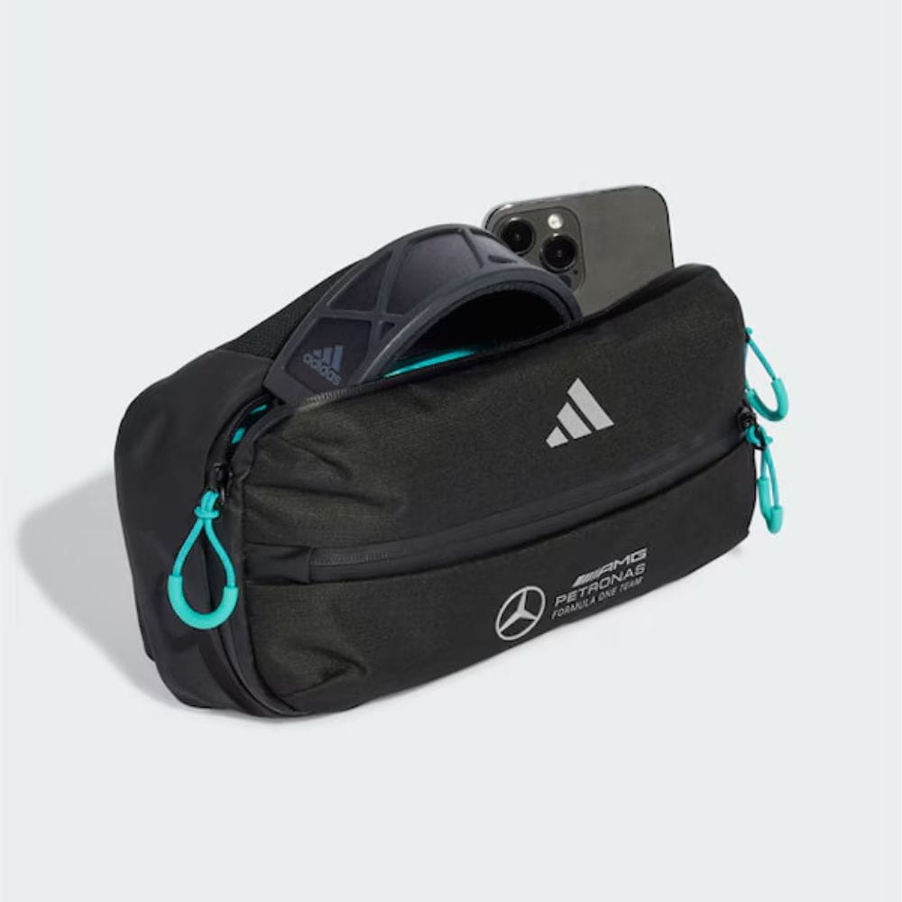 Turkusowo-czarna saszetka to nie tylko modny dodatek, ale także wygodny sposób na bezpieczne przechowywanie cennych przedmiotów. Kieszeń na zamek błyskawiczny ma między innymi oddzielne przegródki, dzięki którym klucze, gotówka, karty i inne drobiazgi są doskonale uporządkowane i zawsze pod ręką. Odblaskowe nadruki zwiększają widoczność saszetki o zmierzchu lub w ciemności. Logo MERCEDES-AMG PETRONAS FORMULA ONE TEAM i logo adidas nadają saszetce sportowy wygląd.