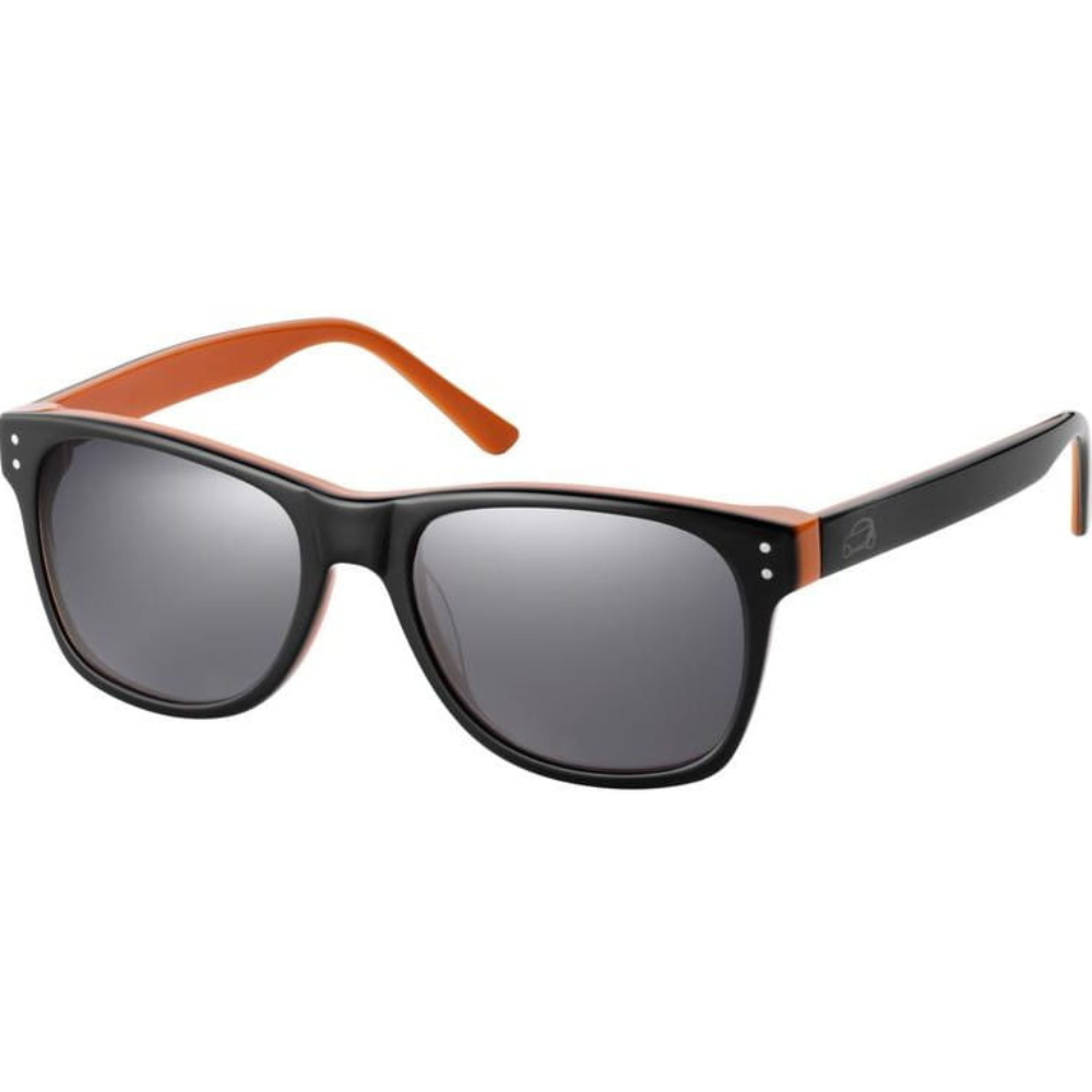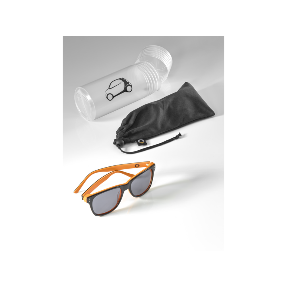 Najważniejszym elementem tych sportowych okularów przeciwsłonecznych jest dwukolorowa oprawka z acetatu, która jest czarna na zewnątrz i pomarańczowa wewnątrz. Szare soczewki zapewniają ochrone kategorii filtra 3/UV 400 oraz 100% ochrone przed promieniowaniem UVA i UVB. Okulary przeciwsłoneczne są dostarczane w plastikowym pudełku z zakrecanym zapieciem i eleganckim nadrukiem piktogramowym, a także w czarnym etui z mikrofibry, które można również wykorzystać jako ściereczke do czyszczenia. Dyskretny, inteligentny piktogram jest nadrukowany na zewnetrznej stronie ramienia, a czarne logo inteligentnego pierścienia na wewnetrznej stronie ramienia.