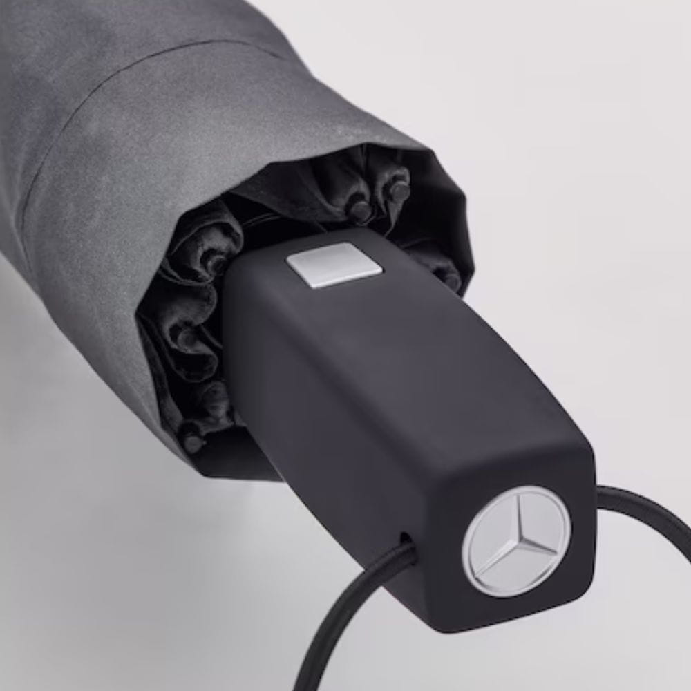 Ten parasol to nie tylko funkcjonalny dodatek, lecz może również służyć jako stylowy element garderoby, który chętnie zabiera się ze sobą podczas złej pogody. Świadczy o tym również parasol Klasy G, który wykonano z tytanowoszarego pokrycia, z czarną rączką, drążkiem i stelażem. Na rączce również umieszczono gwiazdę 3D, a na dwóch trójkątach parasola znajduje się jasnoszary nadruk z motywem Klasy G. Kieszonkowy parasol nie oznacza również kompromisów pod względem funkcjonalności, ponieważ został wyposażony w wygodny podwójny automat do szybkiego otwierania i zamykania. Wysokiej jakości system „Windproof” zapewnia z kolei maksymalną elastyczność stelaża, a dzięki ośmiu trójkątnym panelom jest odporny nawet na silne podmuchy wiatru. Aby zapewnić dobry chwyt podczas wiatru i złej pogody, parasol wyposażono również w czarną, miękką rączkę o kwadratowym profilu, na której znajduje się przycisk zwalniający.