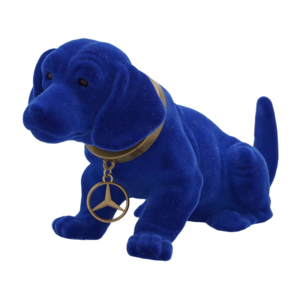 Brązowy jamnik-kiwaczek wykonany z niebieskiego sztucznego futra wygląda świetnie i ożywia kult lat 60. Atrakcyjny wygląd małego pieska uzupełnia złota obroża z gwiazdą Mercedesa ze stali szlachetnej. Naprawdę przyciąga wzrok!