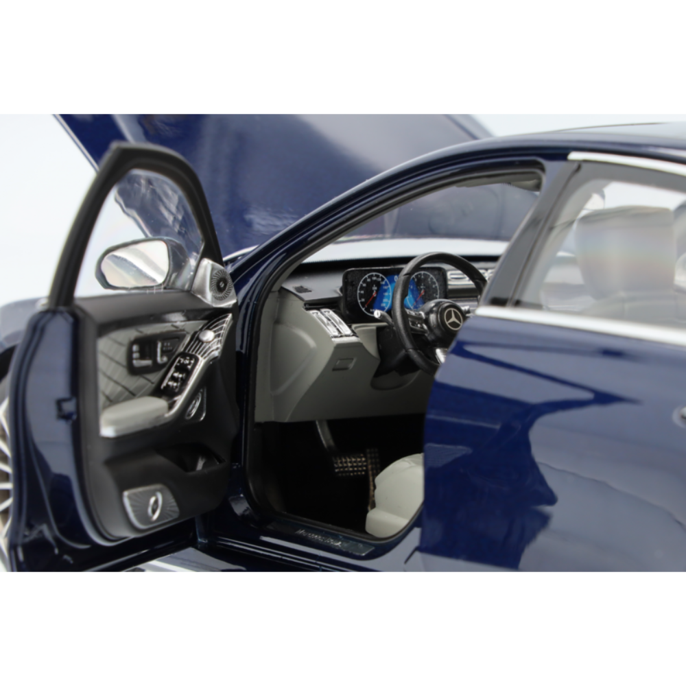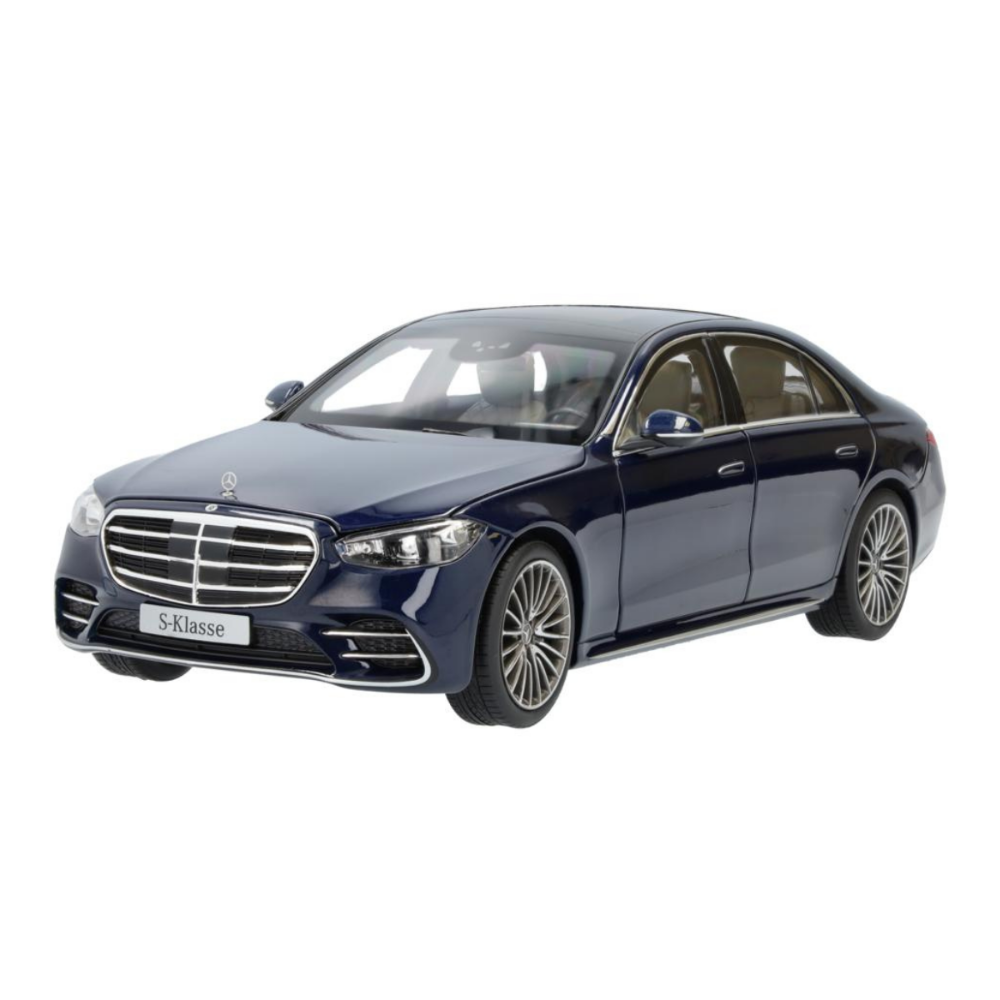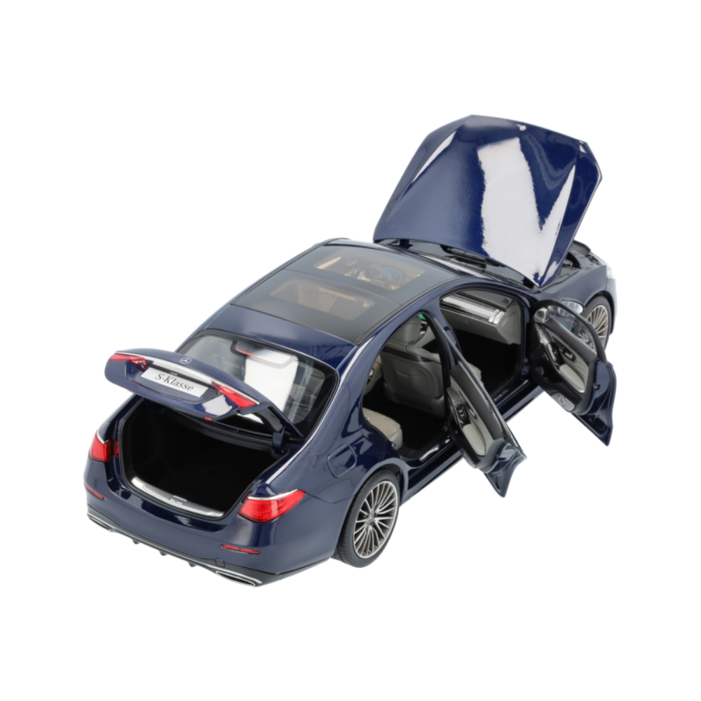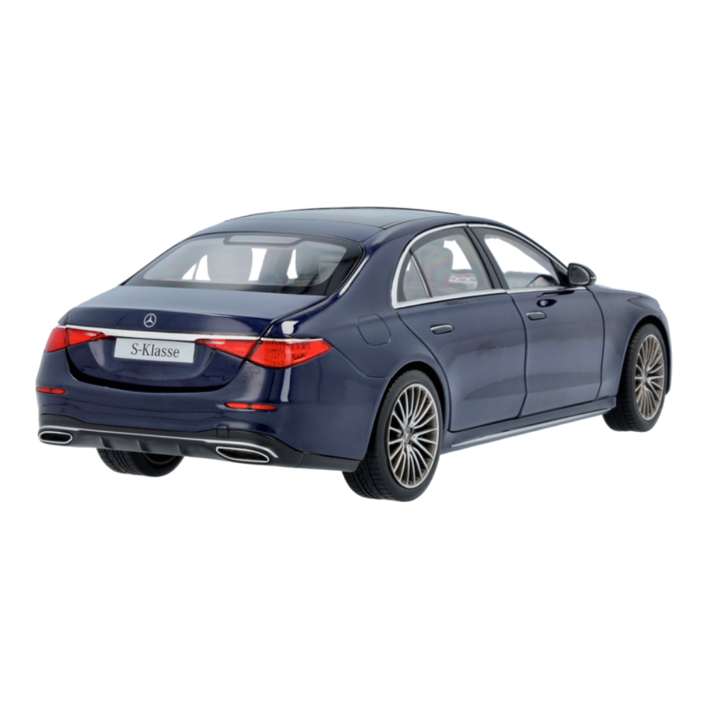 Ręcznie składany oryginał jest odtwarzany z największą dbałością o szczegóły: wersja Klasy S Limuzyna z długim rozstawem osi jest nie tylko pomalowana na autentyczny kolor, ale także inspiruje dokładnym odwzorowaniem wszystkich detali wnętrza – od wysokiej jakości zdobione wnętrze aż po flokowane wnętrze i podłogę bagażnika. MULTIBEAM LED, panoramiczny dach, trójwymiarowy wyświetlacz kierowcy oraz 21-calowe (53,3 cm) obręcze kół AMG ze stopu metali lekkich z wieloma podwójnymi ramionami uzupełniają specyfikację tego sportowego samochodu i są wzmocnione przez zlicowane klamki do drzwi oraz wyświetlacz multimedialny OLED. Model samochodu jest dostarczany w opakowaniu Mercedes-Benz i zawiera śrubokręt, który umożliwia łatwe wyjęcie modelu. Rękawica jest również zawarta w dostawie jako ochrona przed odciskami palców na szybach lub lakierem nadwozia na modelu.