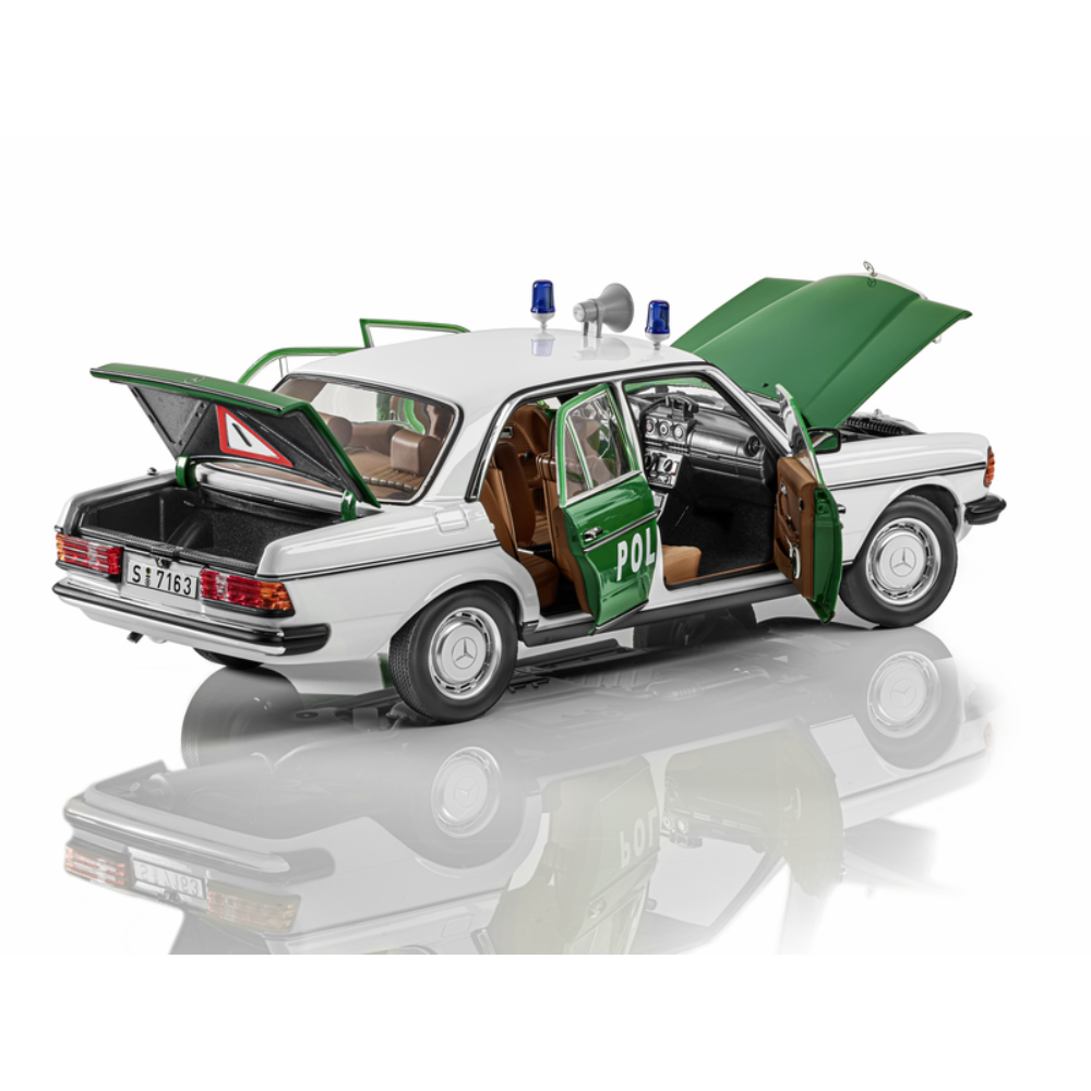 Wraz z serią 123 Mercedes wprowadził w 1976 roku gamę modeli, która różniła się od modeli „Stroke Eight” i ustanowiła nowe standardy pod względem bezpieczeństwa. Najważniejsza poprawa w porównaniu z poprzednią serią modeli: jeszcze bardziej stabilny bezpieczny przedział pasażerski ze wzmocnioną konstrukcją ramy dachu, słupkami dachowymi o wysokiej wytrzymałości i słupkami drzwi oraz wzmocnionymi drzwiami. Seria modeli, która stanowiła idealną bazę dla różnych modyfikacji i mogła być łatwo przekształcona w różne wersje specjalne. Wraz z miniaturowym modelem W 123 do prywatnej kolekcji powiększy się sedan przystosowany do służby policyjnej. Czy to biało-zielony lakier, napis POLIZEI na drzwiach kierowcy i pasażera z przodu, dwie niebieskie lampy ostrzegawcze na dachu i megafon: każdy szczegół, bez względu na to, jak mały, został uwzględniony w tym precyzyjnym modelu. Wnętrze pojazdu również szczyci się dbałością o szczegóły. W rezultacie bardzo szczegółowe wnętrze pojazdu zawiera policyjne radio i zestaw słuchawkowy w kokpicie, a po stronie pasażera z przodu znajduje się urządzenie sygnalizacyjne używane przez niemiecką policję. Model samochodu jest dostarczany w opakowaniu Mercedes-Benz Classic i zawiera śrubokręt ułatwiający wyjmowanie oraz rękawicę chroniącą szyby i lakier przed odciskami palców.