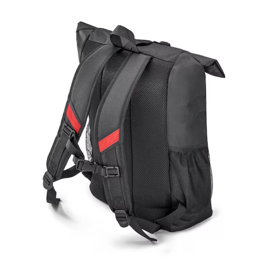 Plecak, który zdobywa punkty swoją elastycznością: plecak AMG w czarno-czerwonym stylu, w którym można łatwo regulować wysokość w wersji zwijanej. Górną część plecaka można łatwo podwinąć i zabezpieczyć za pomocą paska zapinającego. Oprócz dużej komory głównej zapinanej na zamek, plecak zwijany wyróżnia się wieloma innymi funkcjami, w tym dwoma wyściełanymi paskami nośnymi o regulowanej długości, elementem pasa piersiowego z regulacją wysokości oraz wyściełanym elementem tylnym. Całość uzupełnia uchwyt do przenoszenia wykonany ze zszytych taśm, wewnętrzna przegroda zapinana na zamek oraz elastyczna pętla na butelki z napojami. Ozdobne czerwone naszywki w kształcie rombów na paskach naramiennych i czerwony nadruk logo AMG sprawiają, że szczególnie przyciąga wzrok.