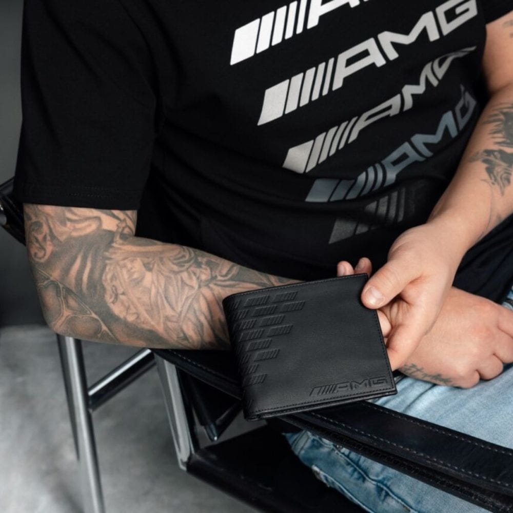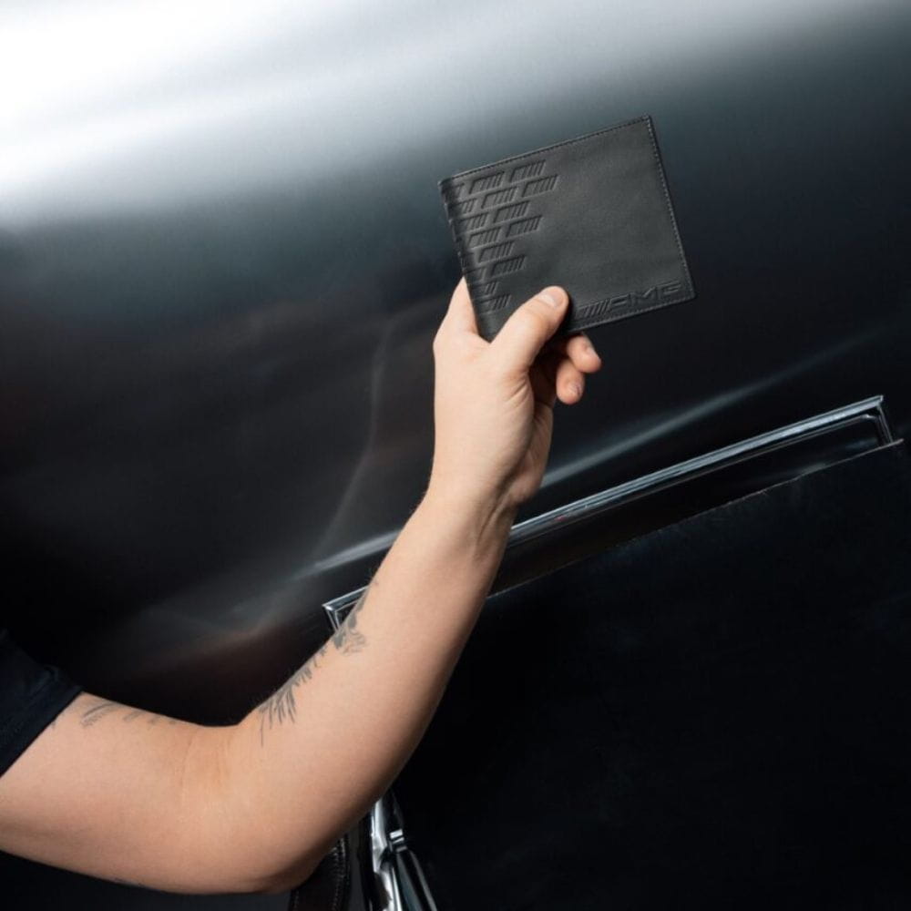 Monety, banknoty, karty - w portfelu AMG możesz przechowywać gotówkę i karty kredytowe z optymalną ochroną. Oprócz dwóch przegródek na banknoty portfel posiada także kieszonkę na monety zapinaną na zatrzask i osiem przegródek na karty, a zabezpieczenie RFID blokuje skanowanie kart bankowych i kredytowych, jeśli karty są przechowywane w zamkniętym portfelu. Ochrona opiera się na specjalnej wyściółce, która zachwyca również estetyką dzięki stonowanemu wzorowi logo AMG. Wykonany z matowej skóry portfel AMG z pewnością zachwyci eleganckim designem, zaokrąglonym po obu stronach wytłoczonym na całej powierzchni wzorem w romby.