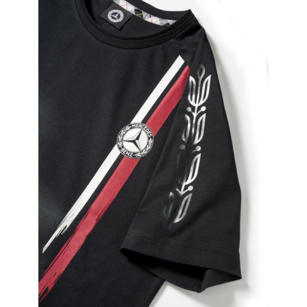 T-shirt męski Mercedes-Benz. Półokrągły dekolt. Nadruk retro samochodu wyścigowego z przodu. Historyczny nadruk liści lauru na ramionach. Dekolt z tkaną plisą ze wzorem w kratkę. Krój slim fit. Historyczna gwiazda Mercedesa z przodu. Historyczny napis „Mercedes” z tyłu.
