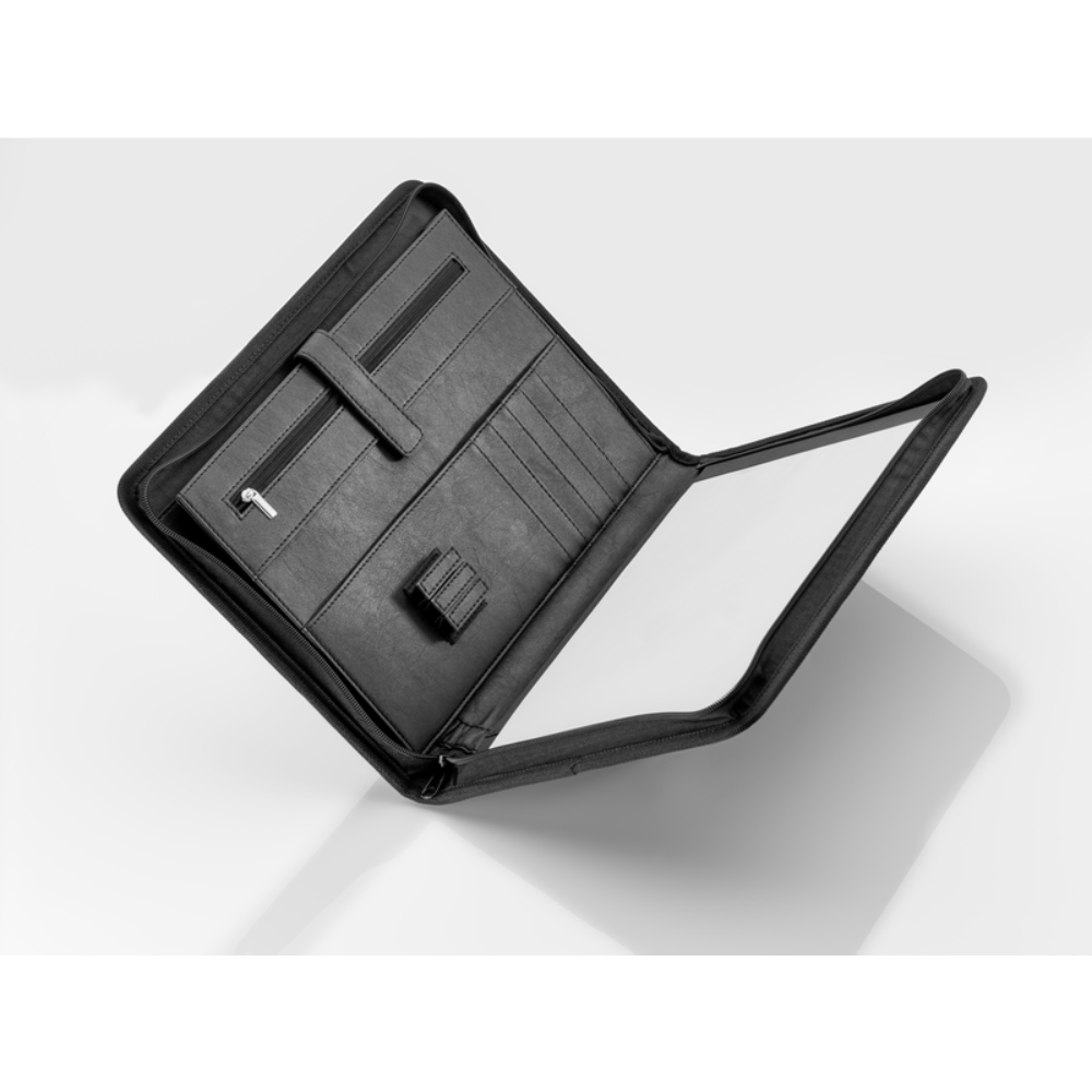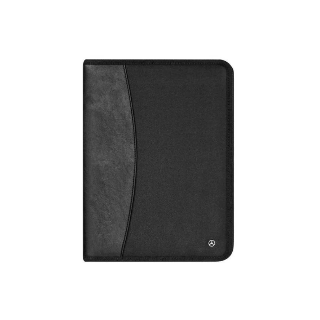 Czarna teczka Mercedes-Benz na dokumenty w wersji czarnej lub z czerwonymi detalami i srebrnym ćwiekiem z gwiazdą Mercedesa. Po lewej stronie teczki można przechowywać dokumenty, długopisy, telefon komórkowy, wizytówki lub tablet, po prawej stronie znajduje się miejsce na blok papieru formatu DIN A4.