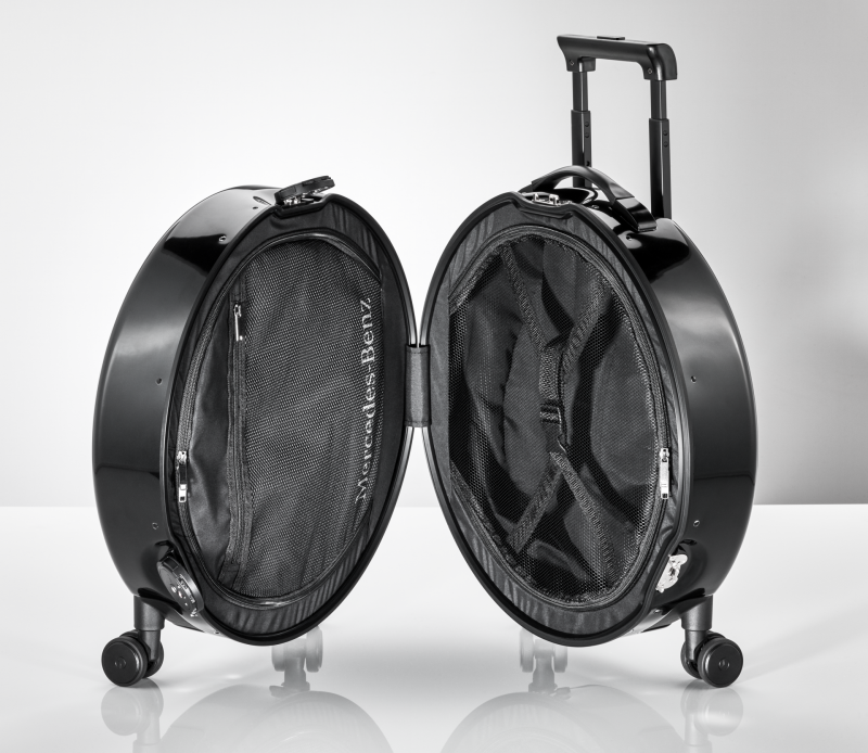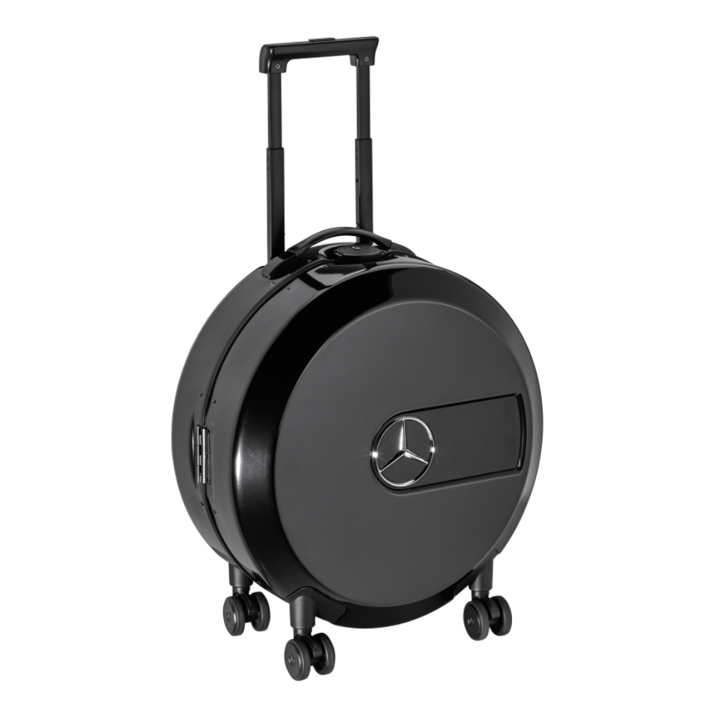 Walizka Mercedes-Benz Klasy G w kolorze czarnym ma twardą skorupę z poliwęglanu, a jej kształt nawiązuje do kultowego projektu osłony koła zapasowego Klasy G. Wewnątrz znajduje się kieszeń z siatki z paskami oraz dodatkowa kieszeń z logo Mercedes-Benz, które ułatwiają uporządkowanie zawartości. Dwa zamki szyfrowe TSA chronią zawartość, a teleskopowa rączka i cztery kółka zapewniają wygodę użytkowania. Walizka jest przede wszystkim wyrazem uznania dla miłośników legendarnej Klasy G Mercedes-Benz – charakterystyczna i o kultowej ekspresji.