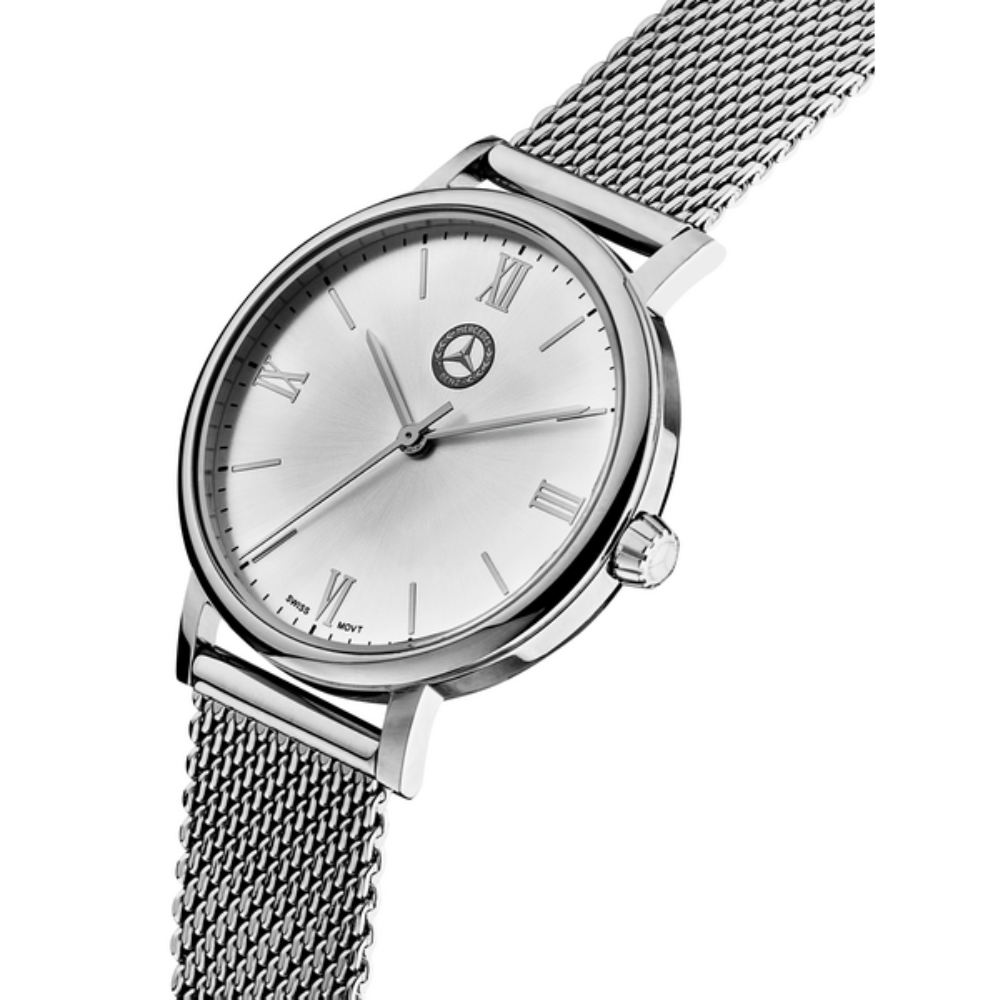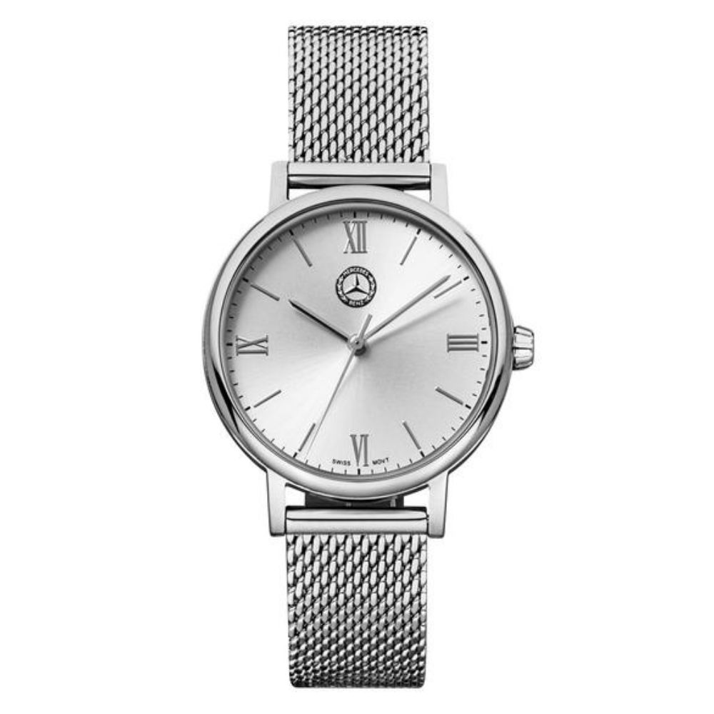 Zegarek damski Classic Lady Silver Mercedes-Benz ma klasyczny i elegancki wygląd, a dzięki kopercie ze stali nierdzewnej i paskowi z siatki Milanese pasuje do każdego stroju. Srebrna tarcza ze stalowymi cyframi rzymskimi i znacznikami godzin, a także srebrne wskazówki podkreślają elegancki wygląd. Zegarek będzie zarówno praktycznym dodatkiem, jak i stylowym elementem biżuterii.