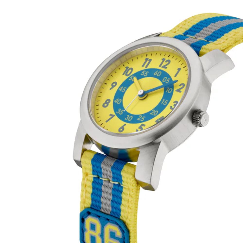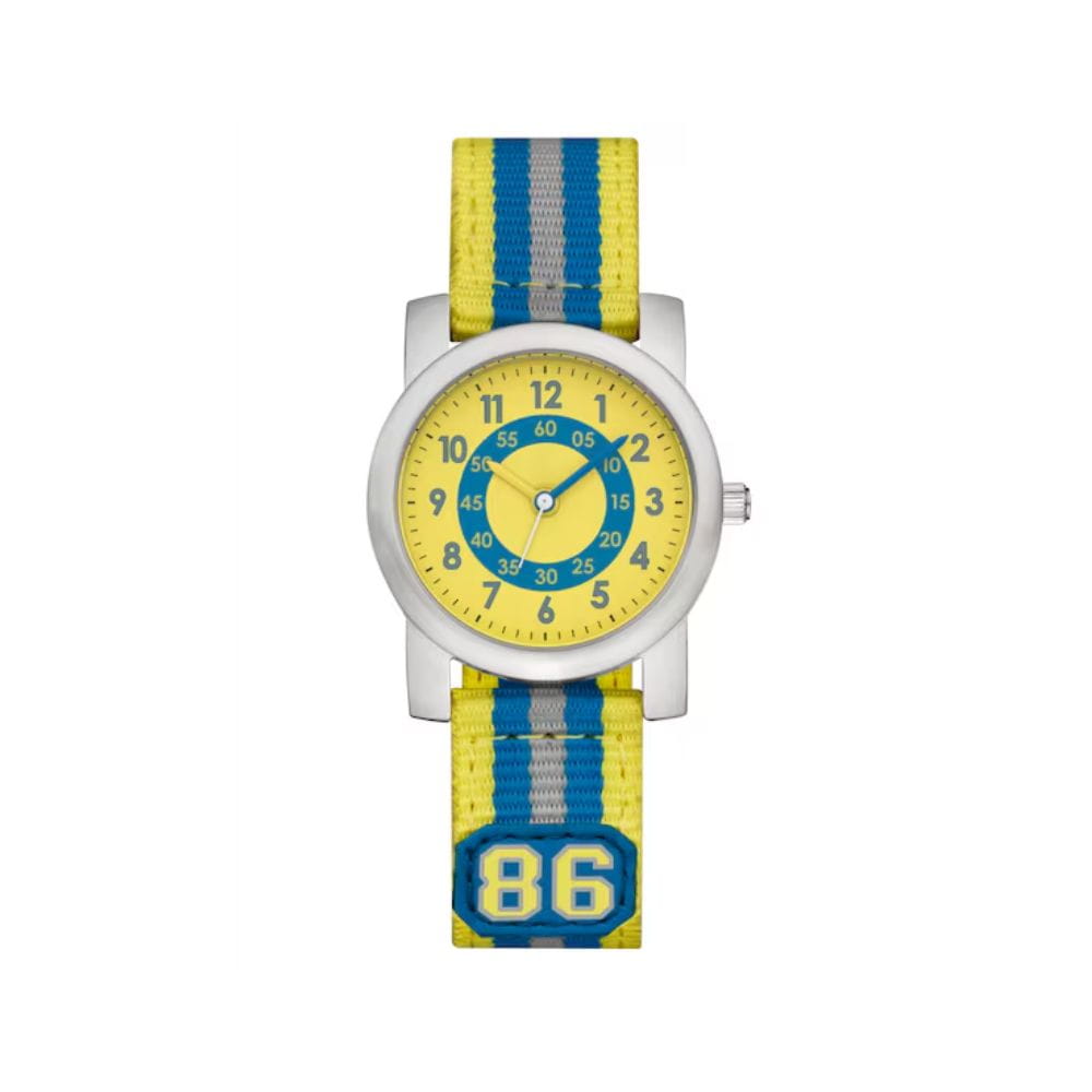 Od punktualnego przybycia do szkoły po przybycie do domu o określonej godzinie – ten zegarek dla dzieci Mercedes-Benz pomaga dzieciom śledzić czas. Zegarek posiada kopertę ze stali nierdzewnej z tarczą podzieloną na niebieską i żółtą strefę. Wskazówki są w kolorze niebieskim, żółtym i białym, aby dopełnić atrakcyjny wygląd. A niebiesko-żółty nylonowy pasek z naszywką „86” sprawia, że jest to zegarek wygodny w noszeniu.