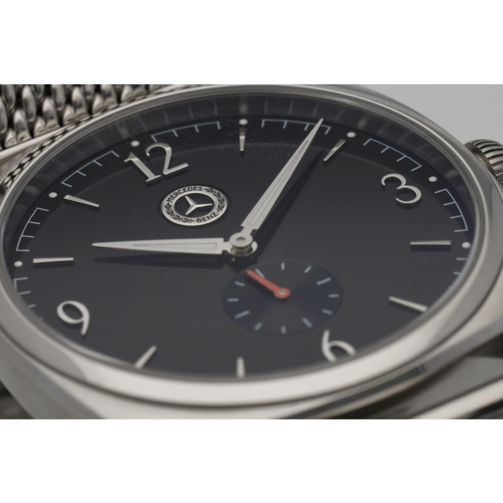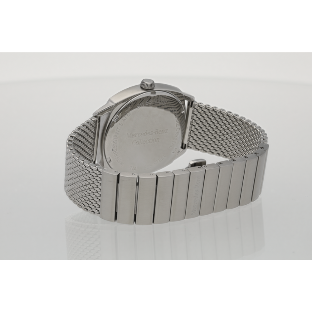 Zegarek męski Mercedes-Benz Classic Tonneau w kolorze srebrnym, czarnym i czerwonym można nosić na wiele różnych okazji. Koperta ze stali nierdzewnej ma polerowane i matowe wykończenie, które tworzy ramę dla wypukłego szafiru z powłoką antyrefleksyjną po obu stronach. Dzięki czemu wyraźnie widać czarną tarczę ze stalowymi indeksami, a także stalowe wskazówki godzin i minut. Oprócz historycznej gwiazdy Mercedesa, umieszczonej na poziomie oznaczenia godziny 12, tarcze mają również podświetlane kropki, pokryte detalem Super-LumiNova®.