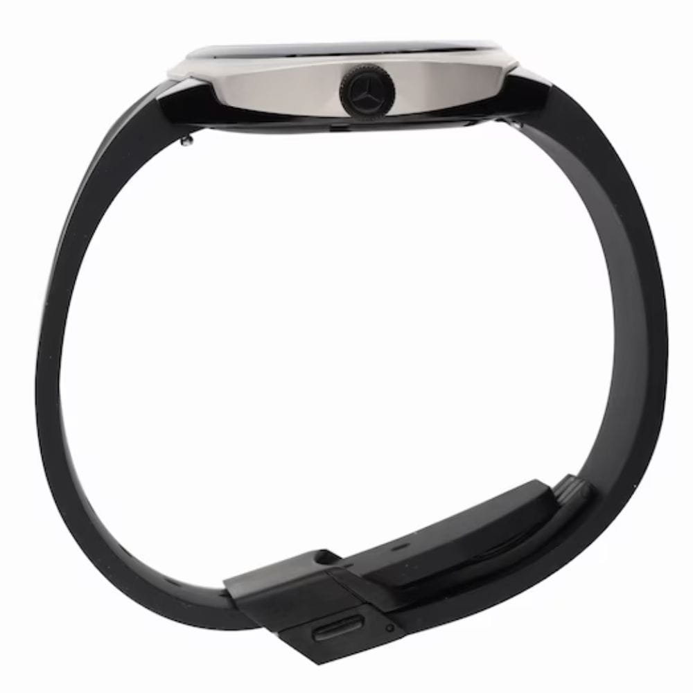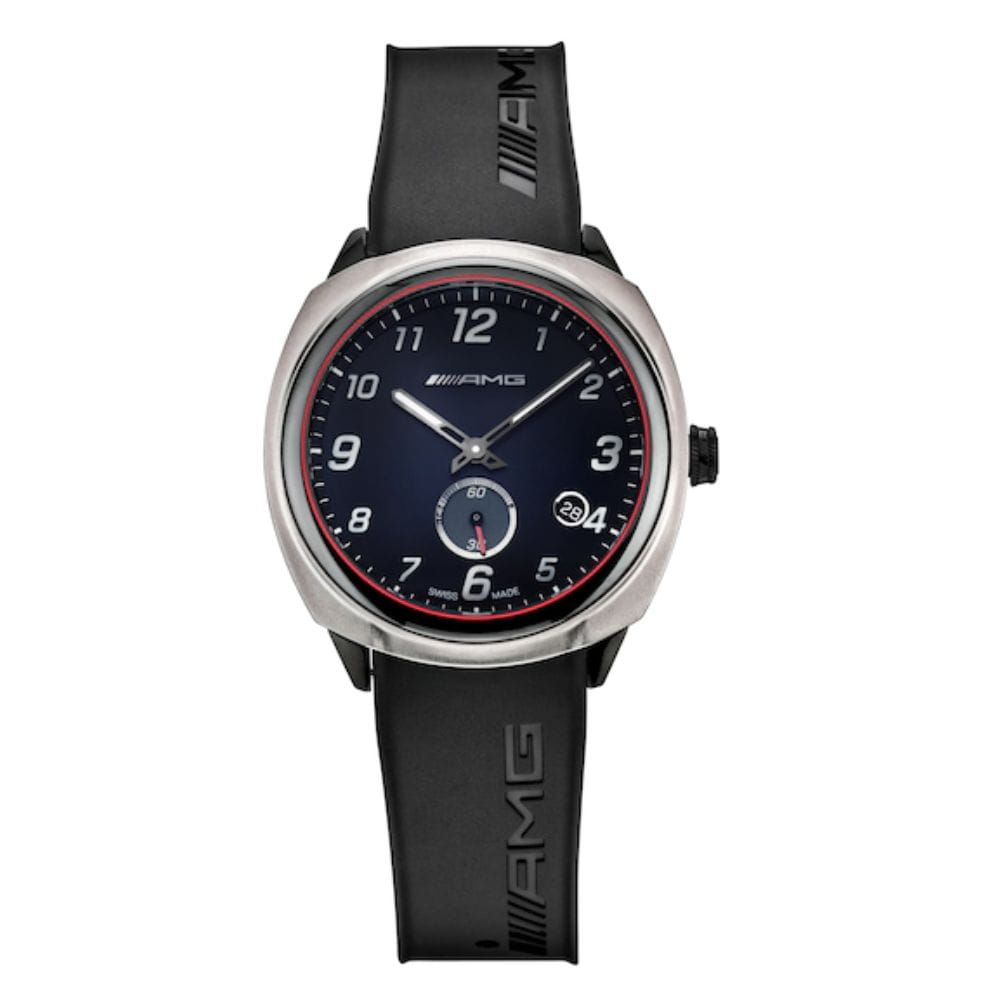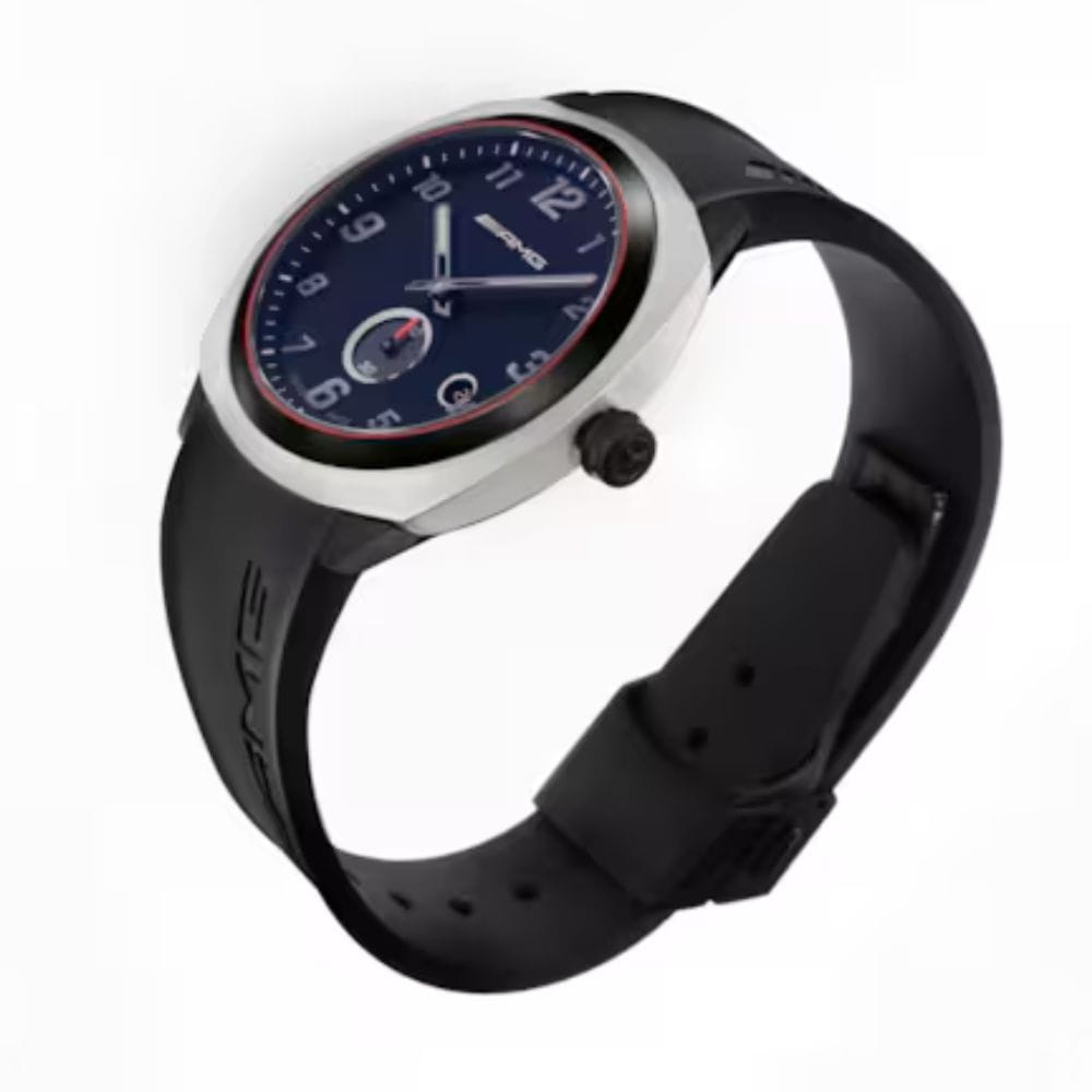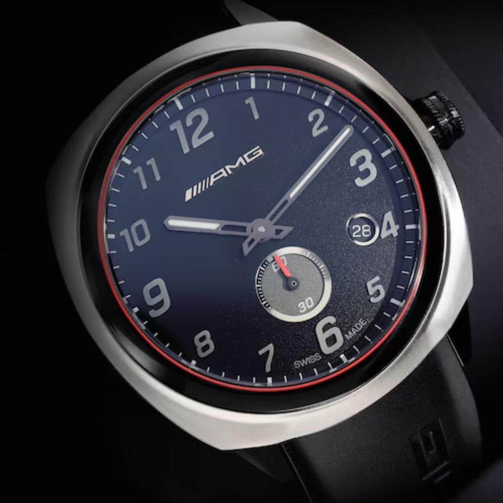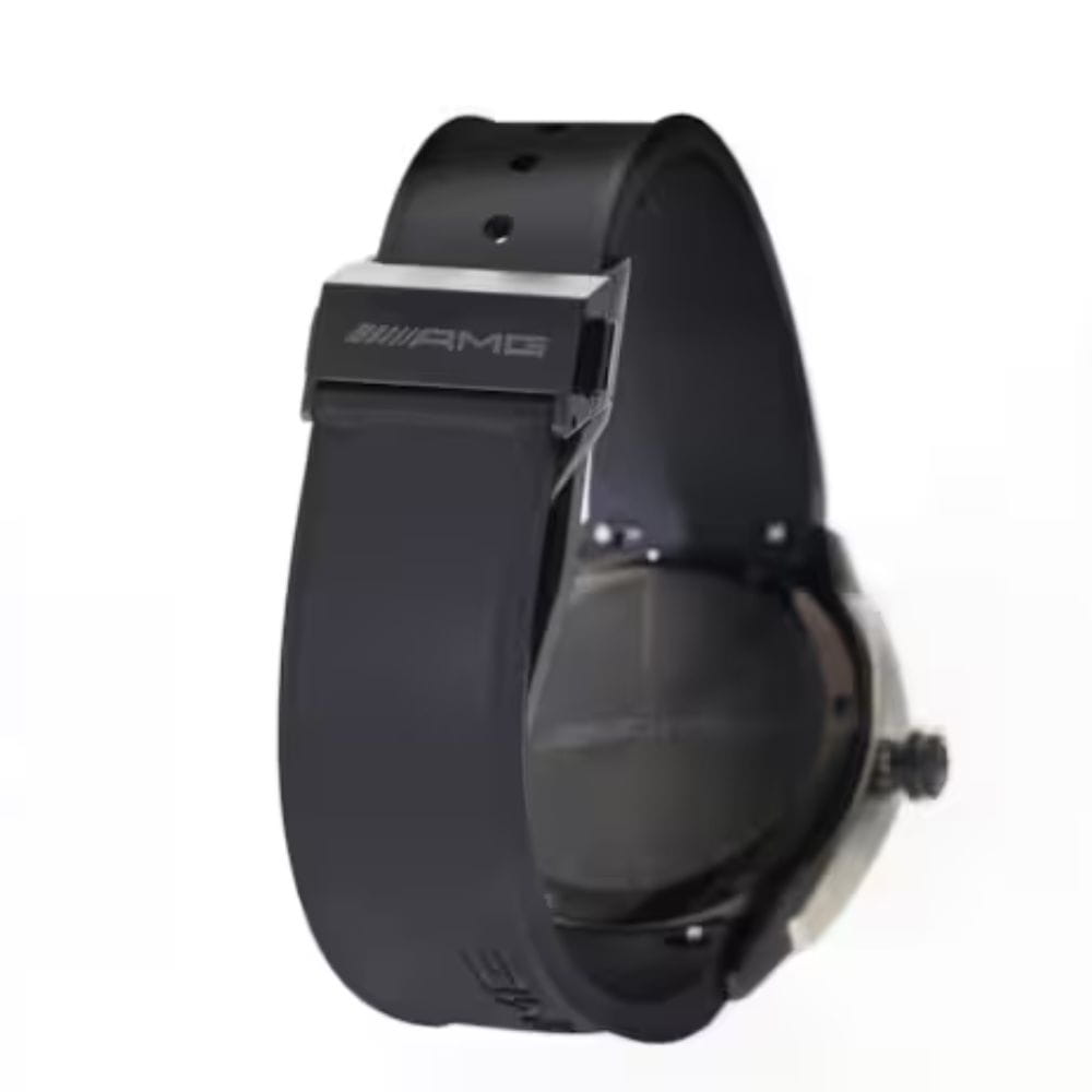 Dynamiczny dowód kunsztu szwajcarskiego zegarmistrzostwa: sportowy zegarek na rękę Mercedes-AMG to nie tylko przyrząd do niezawodnego wskazywania czasu, ale również prawdziwa ikona designu, która spełnia najwyższe wymagania. Wewnątrz zegarka umieszczono szwajcarski mechanizm kwarcowy Ronda 6004 z zewnętrznymi sekundnikami, a charakter tego czasomierza definiuje w szczególności filozofia projektowania AMG. Na przykład wieloelementowa forma obudowy zachwyca nakładaniem się na siebie różnych warstw, rozpiętymi powierzchniami i zwężeniem w kierunku podstawy obudowy, aby odsłonić coś nieoczekiwanie nowego pod każdym kątem. Design w stylu High-Performance podkreśla również polerowana na wysoki połysk czarna ceramiczna luneta z delikatnymi czerwonymi konturami, podczas gdy połączenie tytanu i stali szlachetnej zapewnia odpowiednią wagę i optymalny komfort noszenia. W ochronnym szafirowym szkiełku wzrok przyciąga elegancki cyferblat z aplikacjami 3D utrzymany w prostym, sportowym stylu. Znajduje się na niej dwanaście ręcznie nakładanych cyfr wykonanych z mieszanki ceramiki i masy świecącej Super-LumiNova®. Te wystające elementy są ładowane światłem, dzięki czemu cała tarcza świeci w ciemności. Technologia ta znana jest pod nazwą Globelight XP© i została opatentowana w Szwajcarii. Delikatnie połyskujące logo AMG doskonale dopełnia stylistykę cyferblatu. Dodatkowy komfort zapewnia kauczukowy pasek zegarka, którego składane zapięcie zaprojektowano w taki sposób, że jego odpowiednik biegnie po wewnętrznej stronie i nie wymaga stosowania szlufek.