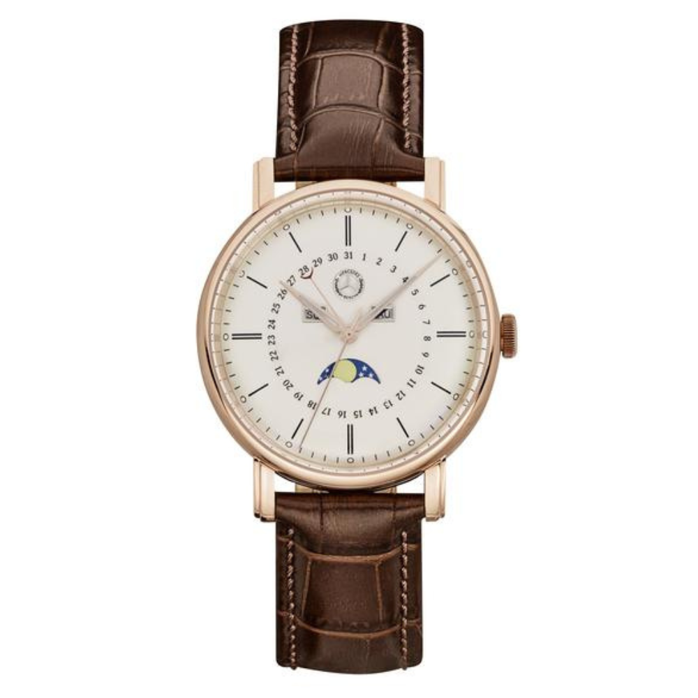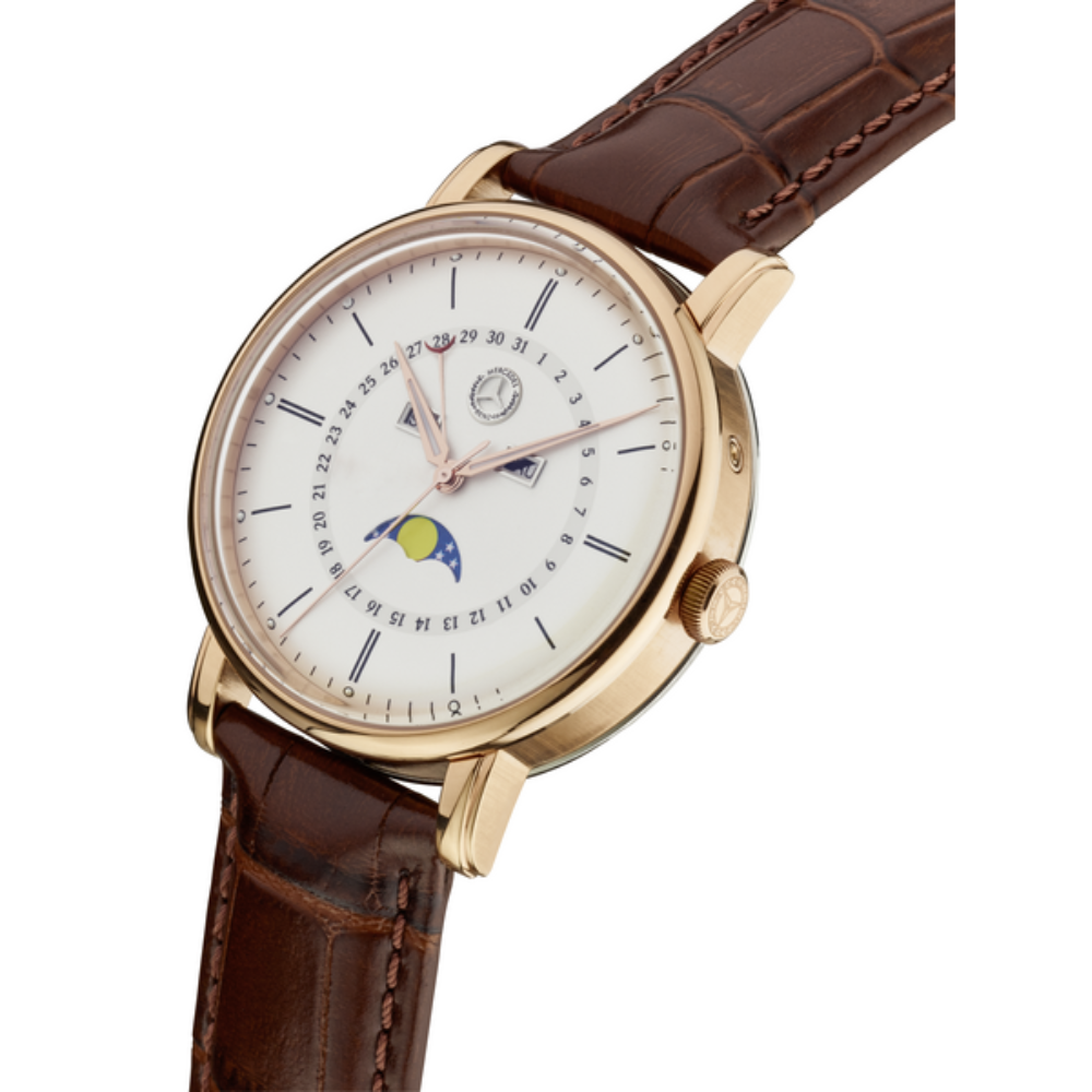 Praktyczny i modny dodatek: męski zegarek Classic Gold Mercedes-Benz. Zegarek ma obudowę ze stali nierdzewnej z powłoką PVD w kolorze różowego złota i wypukłą tarczę w kolorze srebrnym z precyzyjnie wydrukowanymi godzinami i minutami oraz świecącymi kropkami Super-LumiNova®. Brązowy pasek ze skóry cielęcej z efektem krokodyla dopełnia stylowy wygląd zegarka, zapewniając jednocześnie optymalne dopasowanie. Aby zapewnić łatwe odczytywanie godziny w dzień i w nocy, zegarek ma świecące wskazówki w kolorze różowego złota. Jest również wyposażony w funkcję daty i wskazuje fazę księżyca.
