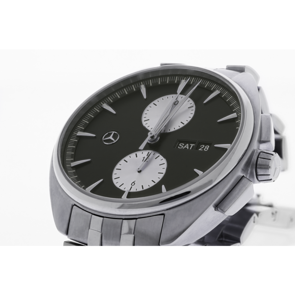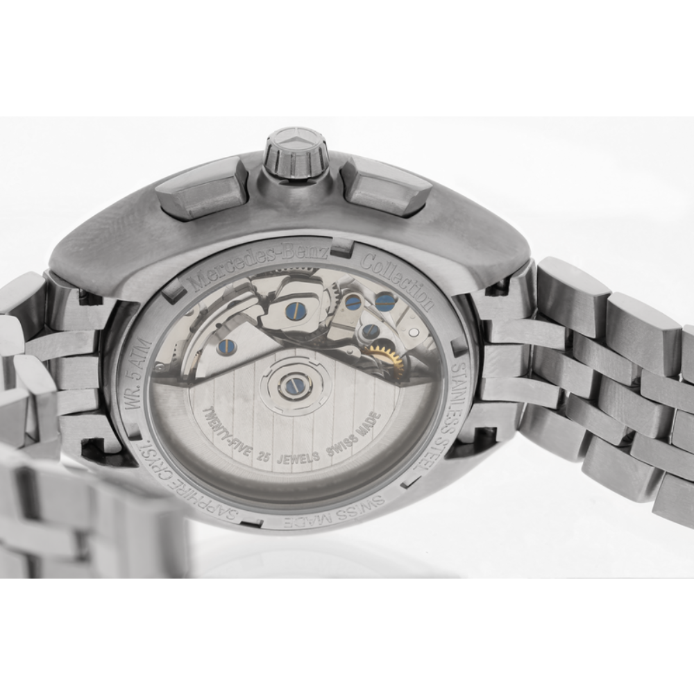 Automatyczny chronograf męski Mercedes-Benz w kolorze srebrno-czarnym został zaprojektowany z kopertą ze stali nierdzewnej z polerowanymi i matowymi wykończeniami, która tworzy ramkę dla wypukłego i przeciwodblaskowego szafirowego kryształu po obu stronach. Dzięki podstawie, również wykonanej z szafirowego kryształu, widoczny jest automatyczny mechanizm szwajcarskiego Sellita SW500, a wielostopniowa struktura czarnej tarczy tworzy ciekawy trójwymiarowy wygląd, wzmocniony gwiazdą Mercedesa na poziomiegodziny 9. Igły w kolorze stali oraz indeksy pokryte są detalem Super-LumiNova® i pozwalają na łatwe odczytanie czasu nawet w ciemności. Znacznik godzin 30 minut i 12-godzinny stoper w kolorze srebrnym kontrastują z czarnymi tarczami. Oprócz wskazania dnia i daty na poziomie oznaczenia godziny 3, mechanizm oferuje również praktyczną funkcję stopera.