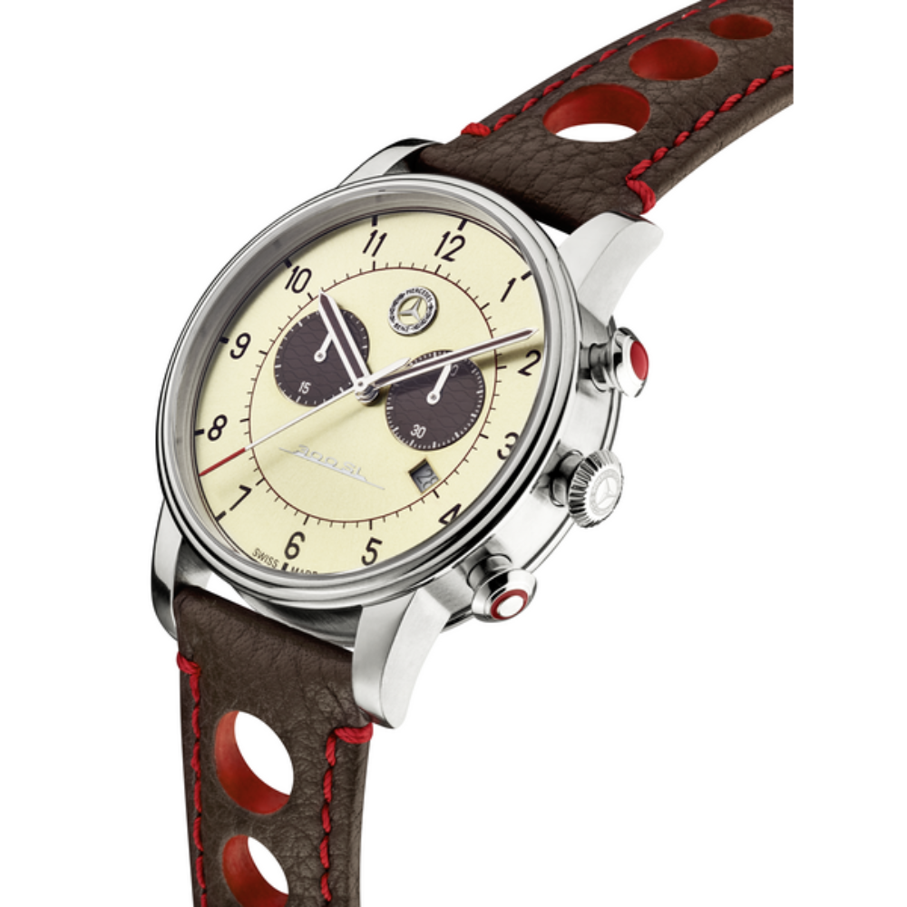 Klasyczny sportowy zegarek ma obudowę ze stali nierdzewnej z czerwoną nakładką. Wyrafinowany wygląd dopełniają tarcza w kolorze beżowo-metalicznym z czerwonymi i brązowymi akcentami, symulowana struktura fali w oczkach, emblemat 300 SL i wskazówki w kolorze stali. Brązowy pasek ze skóry cielęcej z czerwonymi przeszyciami i sportową perforacją zapewnia wyjątkowy komfort noszenia.