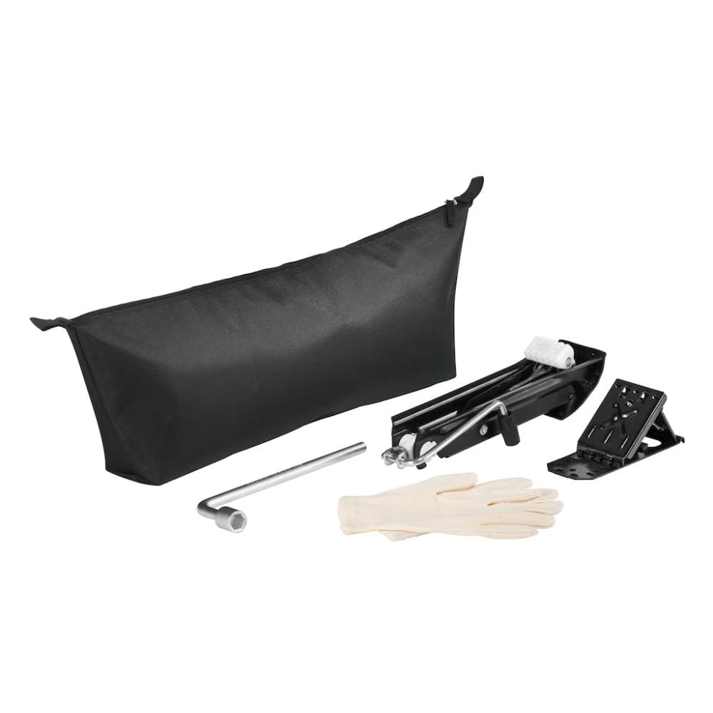 Zestaw narzędzi do pojazdu – czarna torba zawierająca następujące narzędzia: podnośnik, klucz oczkowy, śrubę centrującą koło, klin, płytkę dystansową, rękawice.
